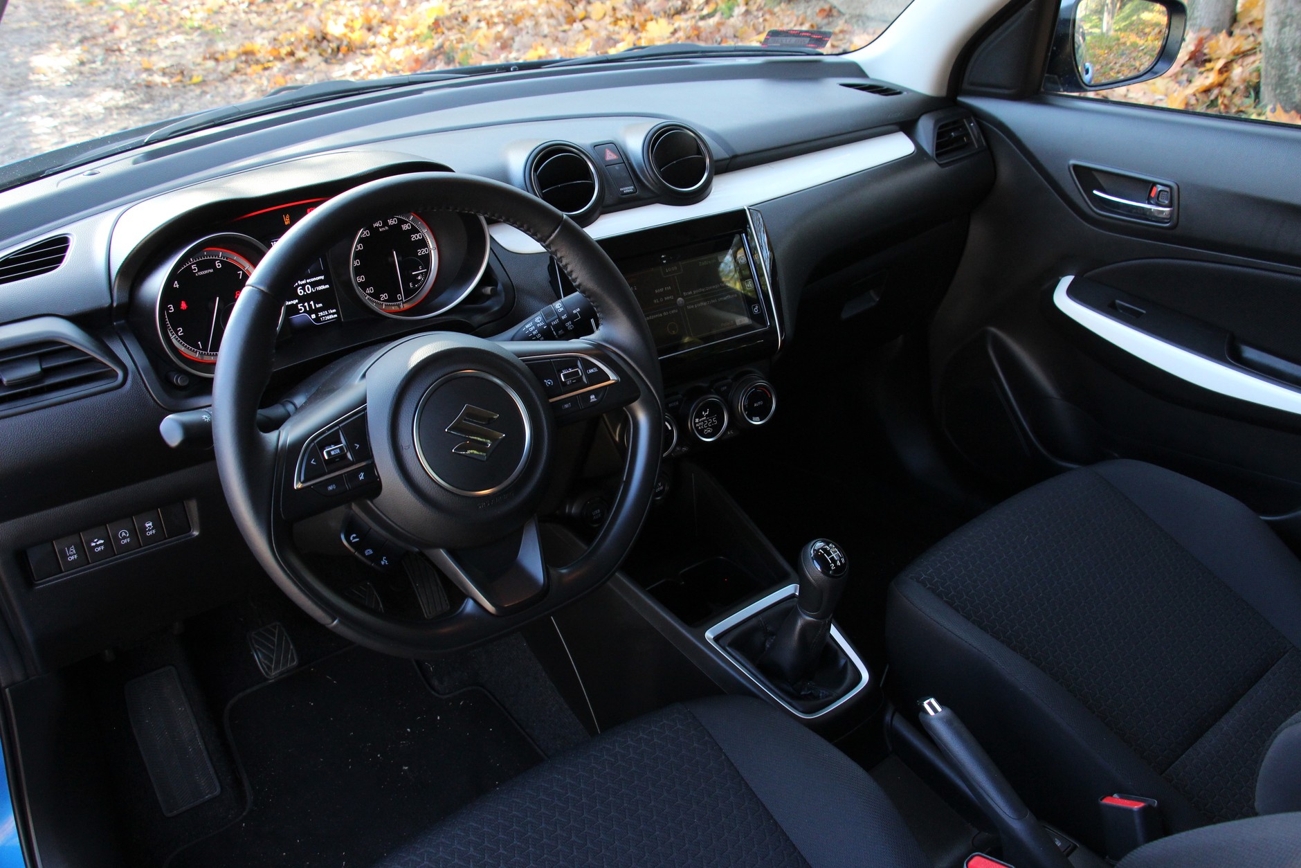 Na autostradzie ujawnia się również konsekwencja wyjątkowo niskiej masy Swifta, czyli nienajlepsze wyciszenie. Suzuki świetnie radzi sobie w mieście, ale kosztem komfortu jazdy przy wysokich prędkościach. Wnętrze, co typowe w samochodach tej klasy wykończone jest twardymi materiałami, ale z pewnością nie jest nudne. Fotele są wystarczająco obszerne i wygodne, a pozycja za kierownicą ergonomiczna. Mamy do dyspozycji multimedia z dużym centralnym wyświetlaczem oraz nowe systemy ostrzegające o niebezpiecznych sytuacjach takich jak przeszkoda na drodze lub mimowolne opuszczenie pasa ruchu.