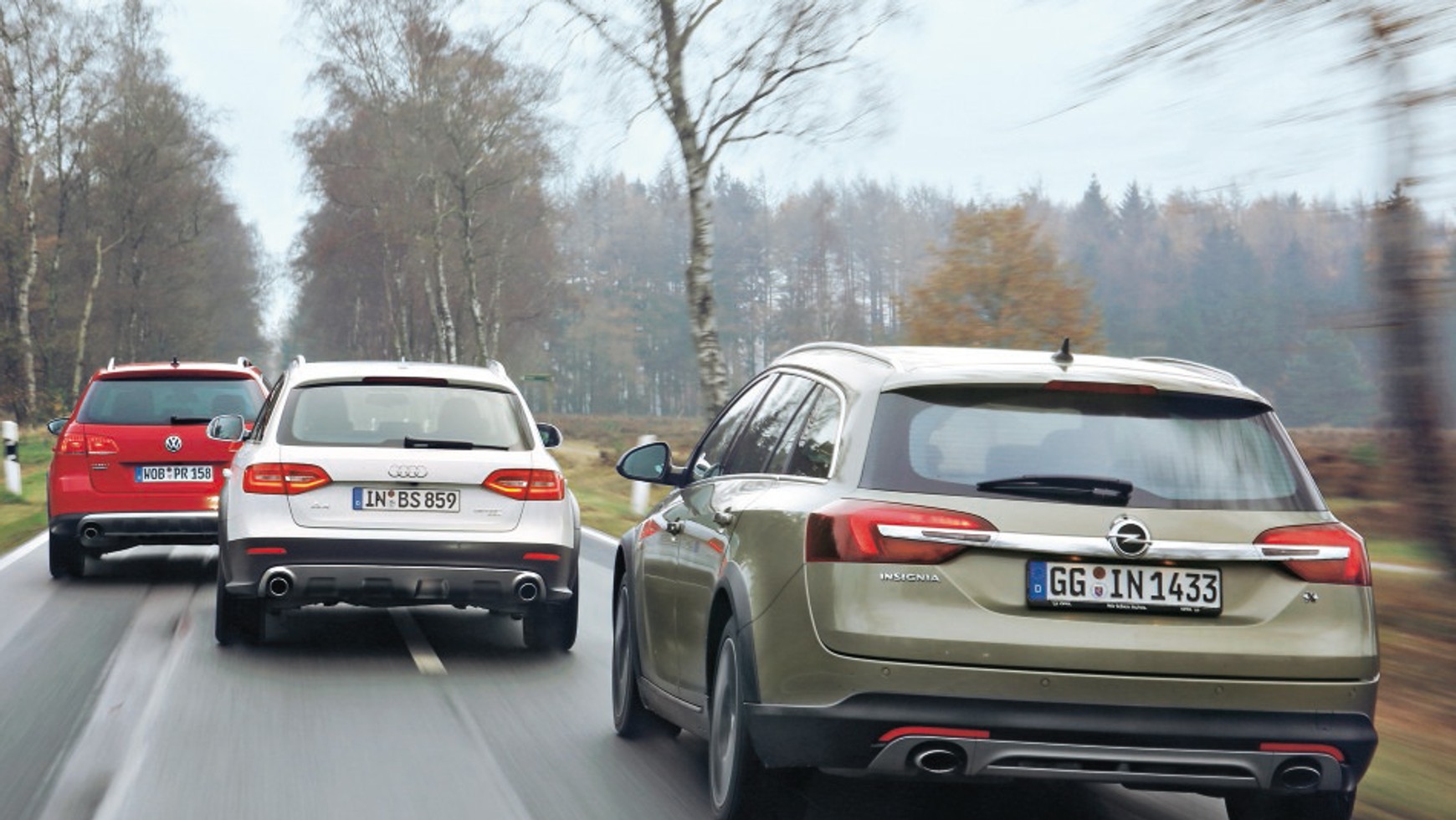 Zajrzyjmy teraz tym czteronapędowym kombi pod maski. Pracująca w Oplu czterocylindrowa, dwulitrowa jednostka benzynowa jest turbodoładowaną świeżynką o mocy 250 KM, zwaną z angielska EcoTec Direct Injection Turbo. W podwyższonym kombi Audi moc 225 KM generuje dwulitrowy silnik TFSI z zaawansowanym technicznie systemem sterowania zaworami, a wyrośniętego Passata napędza 210-konna jednostka TSI. Tak wyekwipowane kombi stanęły do naszego testu porównawczego. Trzeba jednak najpierw określić, czego będziemy od nich wymagać. Decyzja jest taka: biorąc pod uwagę to, że te samochody to pseudoterenówki, będziemy je testowali przede wszystkim na asfalcie.