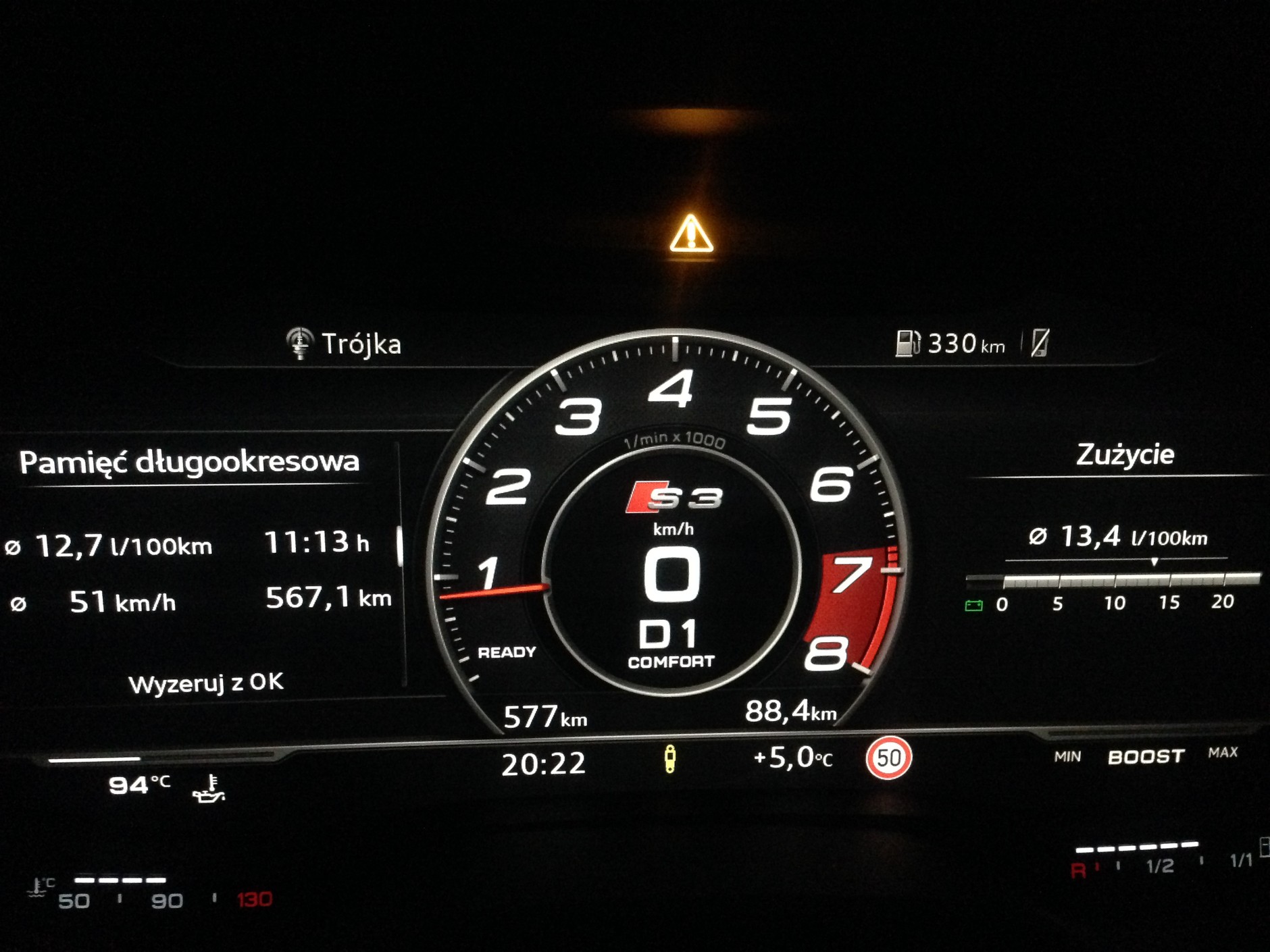 Za nami pierwsze kilometry w nowym S3. Samochód jeździ i pachnie jak nowy bo… cóż, dziwne żeby było inaczej skoro odebraliśmy go z zaledwie kilkoma setkami przebiegu. Na razie oswajamy się z mnogością informacji dostępnych na ekranie za kierownicą i z możliwościami systemu multimedialnego, który wykorzystuje połączenie z Internetem do wyświetlania map Google Earth i łączenia się z serwisami pogodowymi i informacyjnymi. Kilka razy wyskoczył komunikat o nieaktywnym systemie rozpoznawania przeszkód przed samochodem i raz informacja o usterce adaptacyjnych amortyzatorów (4760 zł), ale po wyłączeniu silnika i ponownym uruchomieniu błędy zniknęły.