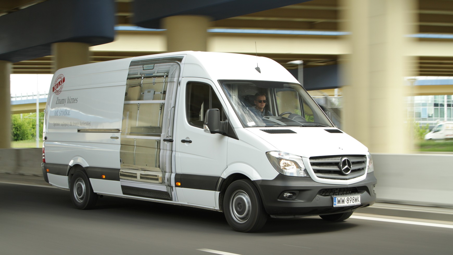 Wsiadamy do superdługiego i superwysokiego Sprintera 313 CDI (129 KM, 305 Nm). Pierwsze zaskoczenie – auto posiada automatyczną skrzynię biegów (7G-Tronic). I nie jest to zautomatyzowana skrzynia ręczna, ale prawdziwy, klasyczny automat. Fotel kierowcy jest oczywiście dodatkowo hydraulicznie resorowany – musimy tylko pokrętłem ustawić swoją wagę, a siła kompensacji nierówności jest odpowiednio dobierana. To rozwiązanie doceni każdy kurier, który autem pokonuje głównie dziurawe miejskie ulice, tym bardziej, że zawieszenie naszego testowego pojazdu określilibyśmy jako sprężyste.