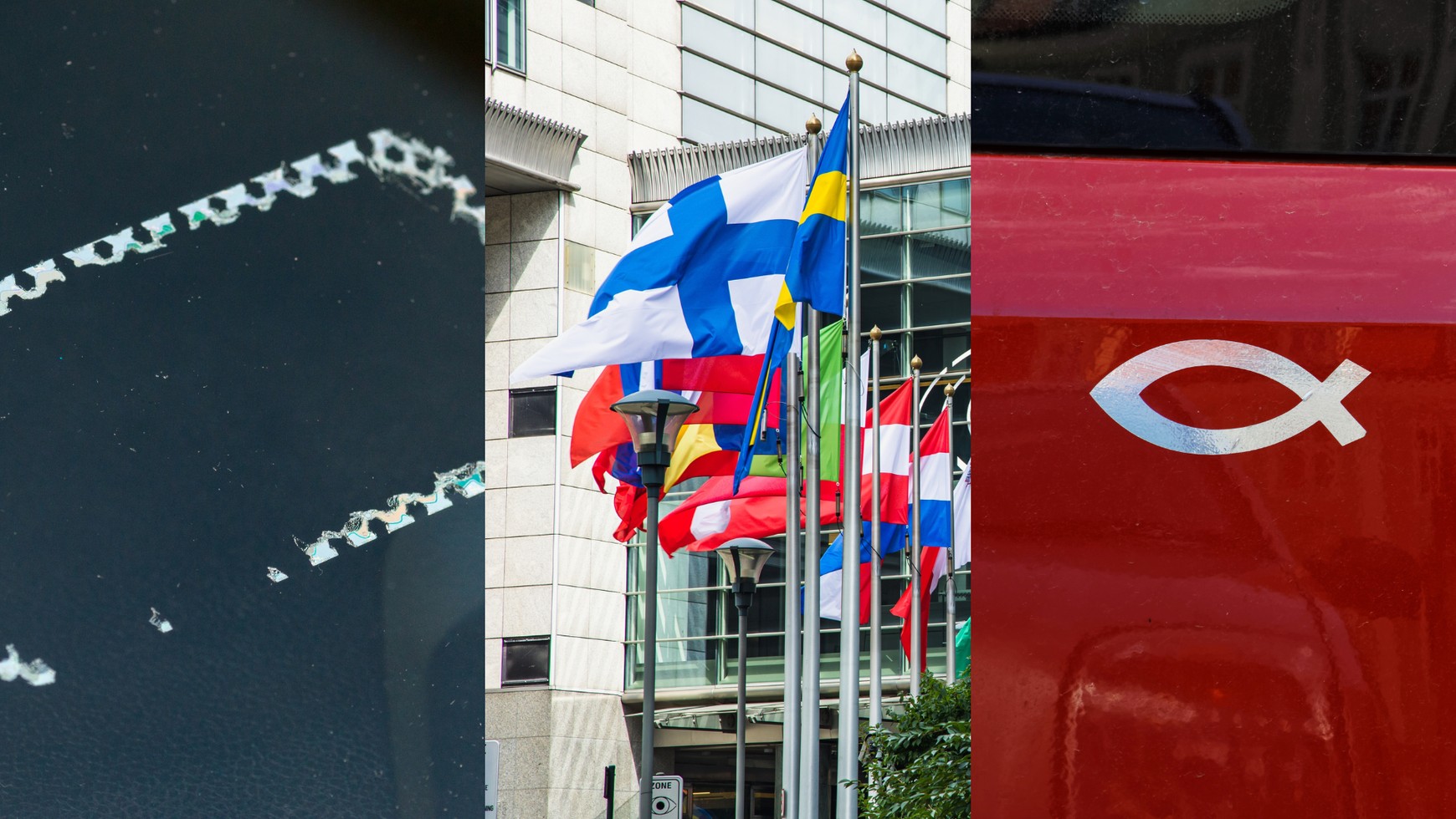 Naklejka z rekinem zjadającym rybę symbolizuje krytykę religii.