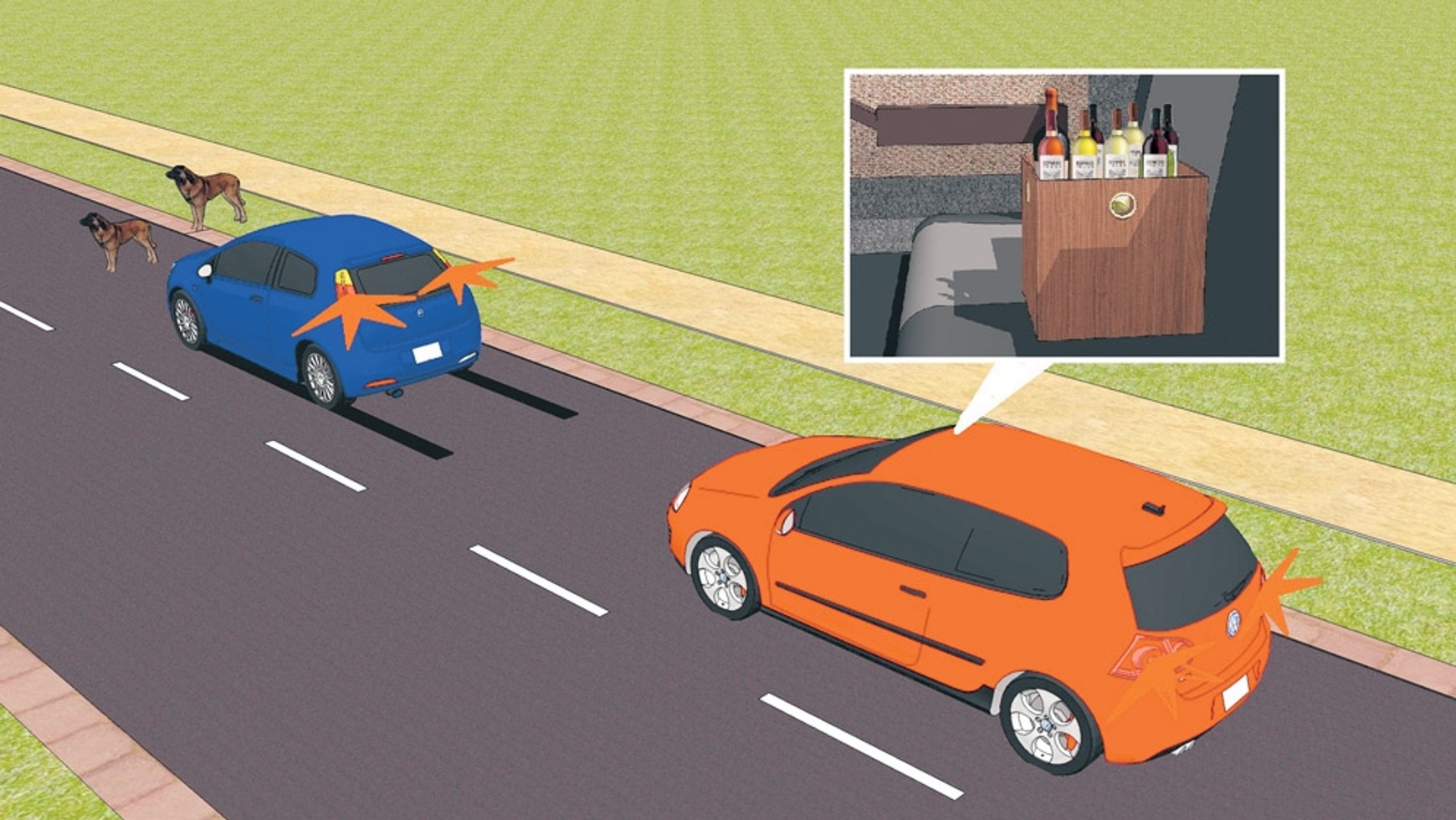 … jednak z jakiegoś powodu hamował jakby za słabo i uderzył w tył Fiata. Dlaczego tak się stało? To proste – myśl o potłuczonych butelkach z winem nie pozwoliła panu Markowi nacisnąć na hamulec odpowiednio mocno. Dlatego zawsze trzeba dbać o odpowiednie przymocowanie bagaży, aby nie przemieszczały się podczas jazdy