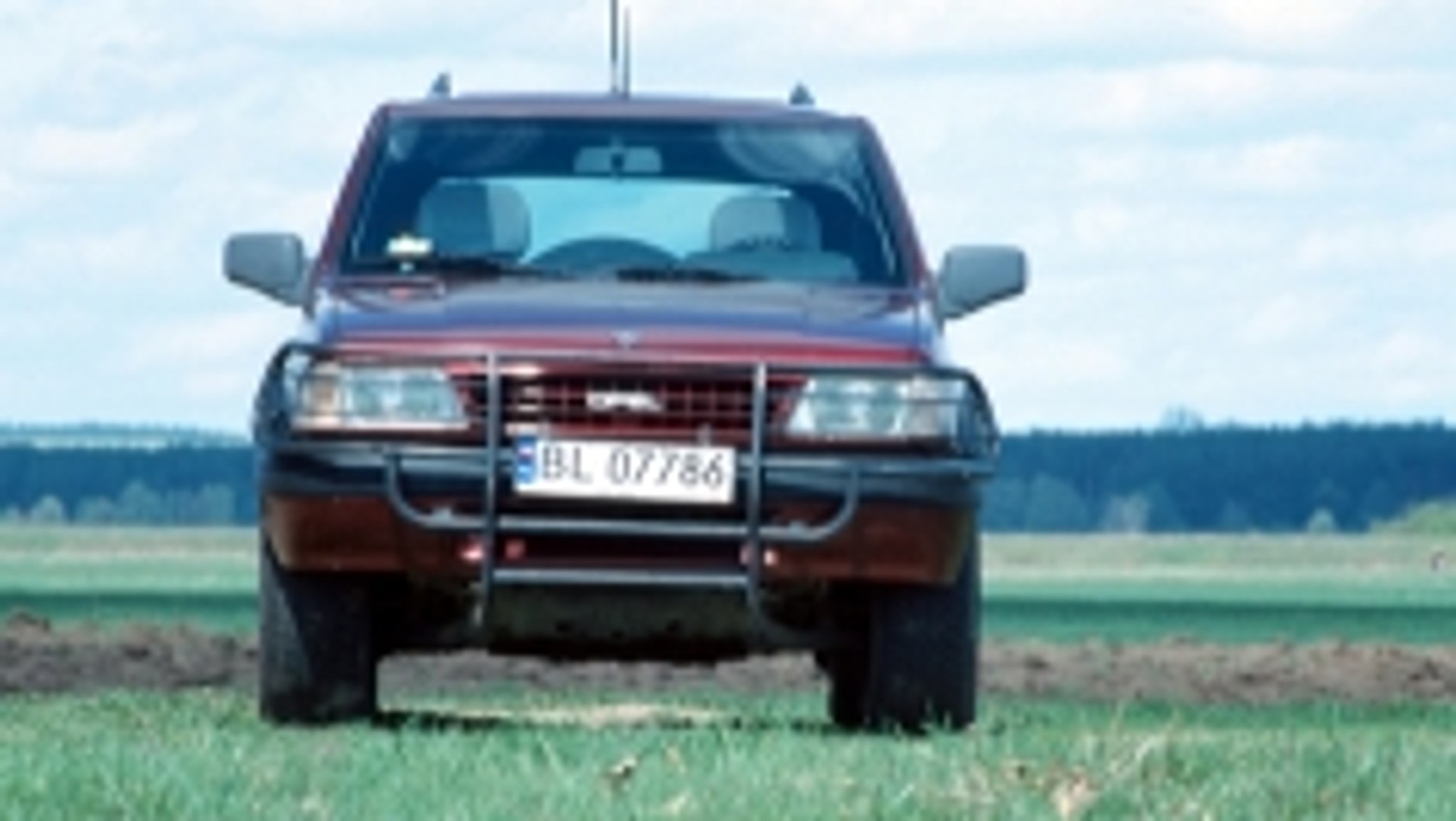 Opel nie zamierzał walczyć w gronie prawdziwych aut terenowych. Konstrukcja Frontery dokładnie odpowiada założeniom klasy SUV, obowiązującym na początku lat 90. Obecnie jednak samochód, który ma ramę, proste rozwiązania w układzie napędowym i sztywny most z tyłu budzi szacunek i obiecuje spore możliwości, jeśli chodzi o wykorzystanie w terenie. Frontera po części spełni te nadzieje, choć do ideału sporo jej brakuje. Dzięki prostej budowie i niezłemu dostępowi do części zamiennych można liczyć nie tylko na tani zakup, ale też na małe wydatki podczas eksploatacji. Bardzo wyraźnie oddzielić trzeba wersję 3-drzwiową (półotwarty Sport), od 5-drzwiowej (klasyczne kombi). Zacznijmy jednak od cech wspólnych. Taka sama jest deska rozdzielcza. Do 1996 r. miała ona archaiczny kształt z dużą ilością bezsensownych przycisków. Jej obsługa, po chwili przyzwyczajenia, nie nastręcza jednak problemów. Ładniejsza jest bez wątpienia wersja po zmianach. Pochwalić trzeba wygodne fotele przednie. W odmianie Sport kierowca i pasażer z przodu osłonięci są na stałe masywnymi słupkami i dachem, jednak osoby jadące w drugim rzędzie siedzeń mogą rozkoszować się widokiem nieba. Początkowo stosowano tylko sztywny hardtop, później wprowadzono wersję z miękkim dachem (softtop). Przyzwyczaić się trzeba do widoku rur klatki bezpieczeństwa. W polskich warunkach zalety plastiku w stosunku do materiału są bezsporne, choć może się okazać, że sztywnego dachu nie będzie nam się chciało zdejmować (to długa i trudna operacja). Zdecydowane różnice wychodzą przy porównaniu tylnej kanapy i bagażnika. Sport oferuje tu dużo mniej miejsca.Rodzinnym czy wycieczkowym zadaniom znacznie lepiej stawi czoła 5-drzwiowe kombi. Jednak większy bagażnik również nie jest bez wad. Podstawową jest… koło zapasowe. Konstruktorzy długo zastanawiali się co z nim począć. Jeśli pojawia się wewnątrz kufra zabiera sporo przestrzeni (pojemność spada z 540 do 430 l). Opcjonalnie umieszczane było na nieporadnym stelażu, odchylanym na bok przed otwarciem klapy. Ta podzielona jest na dwie części: jedną odchylamy do góry, drugą - do dołu, ograniczając dostęp do bagaży. Sytuacja poprawiła się w 1995 r. Dolna część klapy (z zamocowanym kołem zapasowym) odchylana jest od tego roku na bok. Jak na Opla, karoserie Frontery dzielnie opierają się rdzy. Oczywiście zdarzają się zaniedbane egzemplarze, ale też stosunkowo łatwo trafić takie, które są wolne od korozji. W nadwoziu pojawiają się trzaski i szwankują drobne elementy: wycieraczka tylnej szyby, podświetlenia wskaźników itp. Trudno też liczyć na idealną jakość miękkiego poszycia dachu. Jednostki napędowe Frontera zapożyczyła z innych modeli Opla. Dzięki temu są one doskonale znane mechanikom. Benzynowa dwulitrówka napędzała tylko wersję Sport. W 1995 r. przeprowadzono drobne zmiany (większy stopień sprężania, zapłon bezrozdzielaczowy, czujnik spalania stukowego). To prosty silnik o przeciętnej dynamice, spalający około 11 l benzyny. W przypadku zasilania gazowego dość często szwankują przepływomierze. Dla długiej wersji przewidziano silnik 2.4, później 2.2. Pierwszy również ma prostą budowę (zużycie paliwa przy spokojnej jeździe 11-13 l, przy dynamicznej nawet 20 l), drugi zaskakuje wyraźnie lepszą dynamiką i korzystniejszym spalaniem. Przez wiele lat jedynym dieslem (występującym tylko w długiej wersji) był hałaśliwy i pozbawiony temperamentu 2.3. Przyspieszenie testowe do "setki" to niemal 20 s, a spalanie łatwo osiąga 12 l. Kolejne silniki wysokoprężne (2.8 TDI i 2.5 TDS) trafiały już i do wersji krótkiej, i długiej. Szczególnie godny polecenia jest japoński motor 2.8 - hałaśliwy, ale oszczędny i najmniej problemowy. Niestety oferowano go krótko, po czym zastąpiono "czystszym" włoskim VM, który ma już zdecydowanie gorszą opinię. We Fronterach znajdziemy tylko manualne 5-biegowe skrzynie. Wszystkie auta mają też najprostszy układ przeniesienia napędu: stały na tylne koła z dołączaną na sztywno przednią osią, przez co na przyczepnych nawierzchniach jesteśmy skazani na tylny napęd.Łatwo spotkać auta z tylnym mechanizmem różnicowym o ograniczonym tarciu (określanym jako LSD). Nie poprawia to w widoczny sposób własności terenowych, ale wymaga uwagi przy wymianie oleju (inny rodzaj). Szybko zużywają się automatyczne sprzęgiełka przednich piast (można wymienić je na manualne) oraz krzyżaki wału napędowego. W 1995 roku prawdziwą rewolucję przeszło podwozie. Najbardziej widoczne zmiany, to zastąpienie resorów sprężynami oraz całkowicie nowy układ hamulcowy (cztery tarcze wentylowane). Co ciekawe, nawet przed zmianą zawieszenia auto nie było szczególnie twarde, ale komfort jazdy polepszył się bez wątpienia. Jeszcze większą poprawę widać w porównaniu skuteczności hamulców. W przypadku długiej Frontery przeszkadza kiepska zwrotność. Pod względem dzielności terenowej seryjna Frontera wypada przeciętnie. Ma też za słabe podzespoły, by wytrzymały obciążenia wynikające np. z założenia dużych kół. Przeszkadza niewielki prześwit, który z kołami 15-calowymi o szerokości 255 był nieco lepszy niż podany w tabeli - wynosił 215-220 mm. Ale koła te wymagają zastosowania innych przekładni głównych. Mało imponujący jest też skok kół (lekka poprawa po zastosowaniu sprężyn). Niestety nie mamy dużego wyboru, jeśli chodzi o elementy do przeróbek. W przypadku zawieszenia na sprężynach może być to np. zestaw Ironmana (drążki skrętne, sprężyny, komplet amortyzatorów) za około 3300 zł. Trudno znaleźć np. snorkel. Okazuje się, że dużo łatwiej zmienić cokolwiek we Fronterze B.Zdaniem użytkownikaKrótka Frontera okazuje się jednak za krótka, szczególnie gdy mamy do przewiezienia rodzinę. Bagażnik jest za mały, trudno też zająć