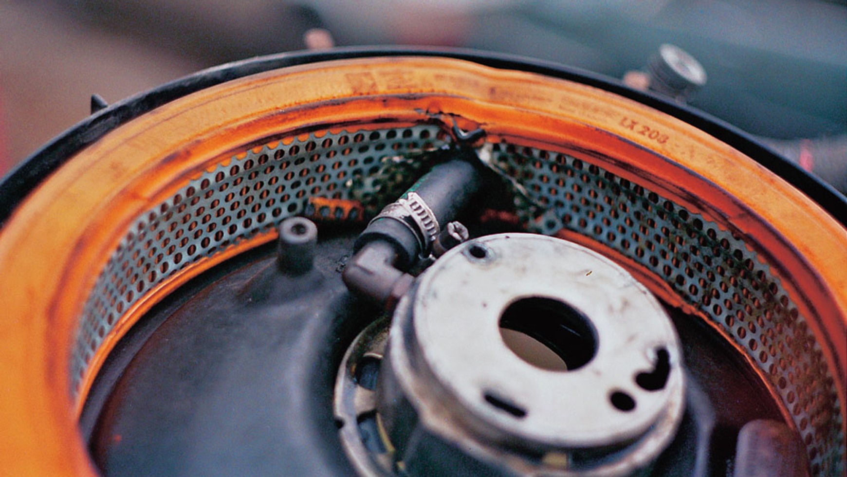 Co zrobił druciarz: na zdjęciu widać wnętrze obudowy filtra powietrza, wewnątrz której partacz zdecydował się zamontować kluczowy element instalacji LPG – mieszalnik gazu. Ponieważ wkład filtra mu w tym przeszkadzał, więc go po prostu przedziurawił (wymiana filtra możliwa chyba tylko po demontażu mieszalnika?).