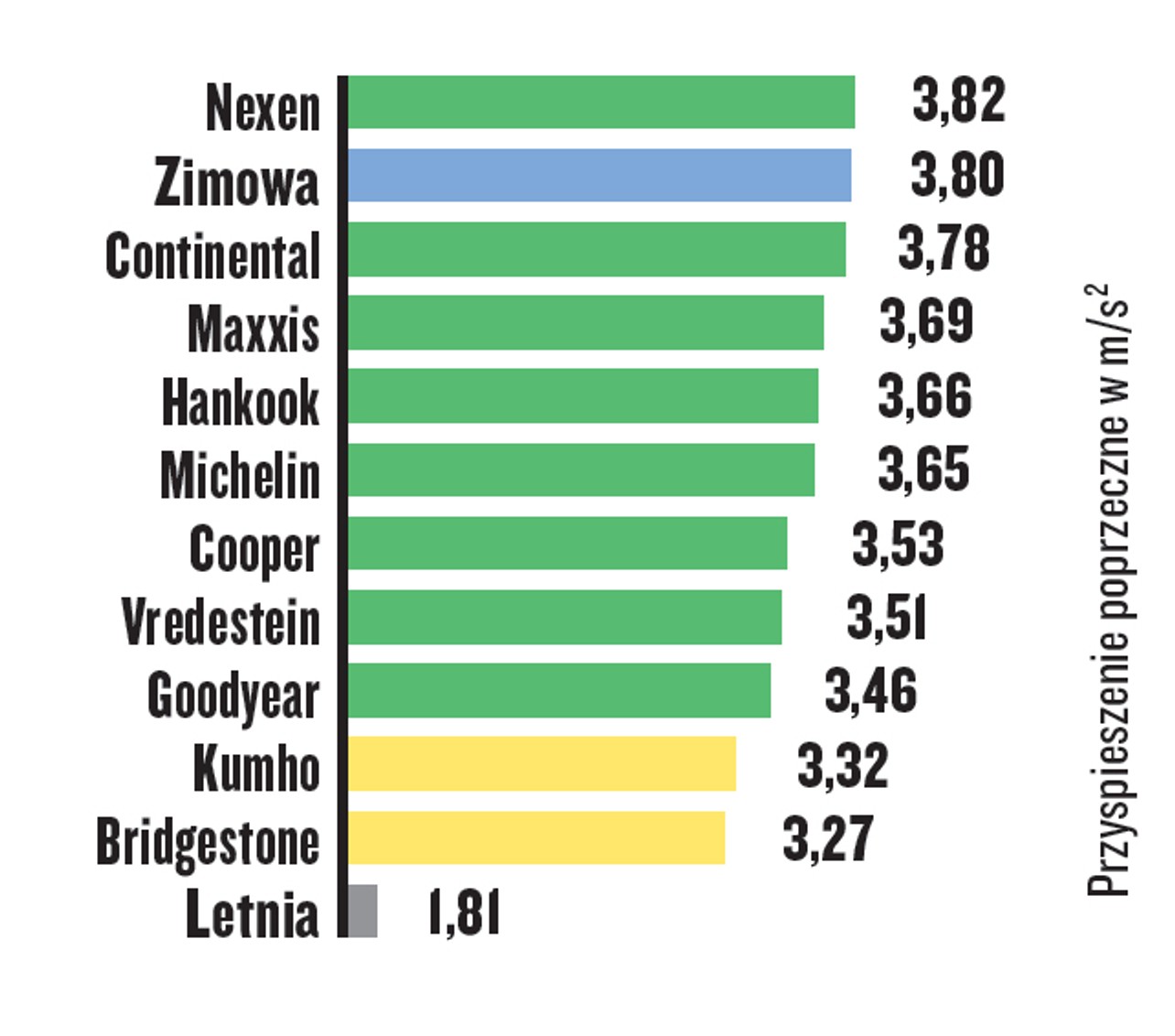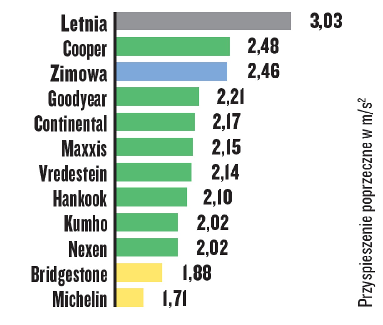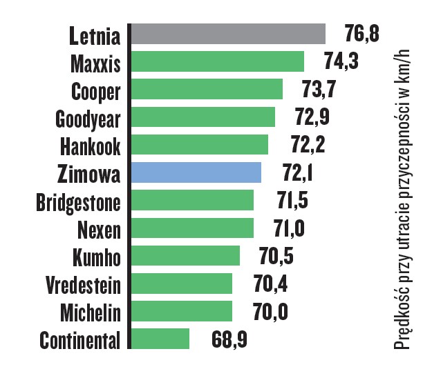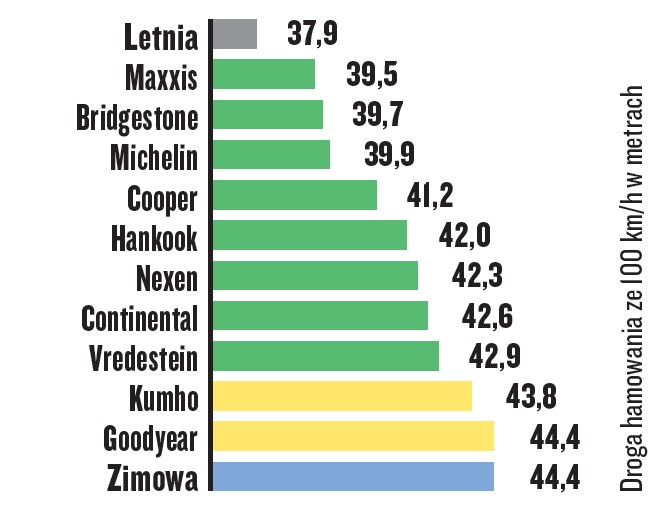 Opony marek Maxxis, Bridgestone i Michelin zapewniają przekonujące wyniki, nieznacznie gorsze niż w przypadku opon letnich. Drogi hamowania na suchej nawierzchni oponach Kumho i Goodyear są takie, jak na dobrych oponach zimowych.