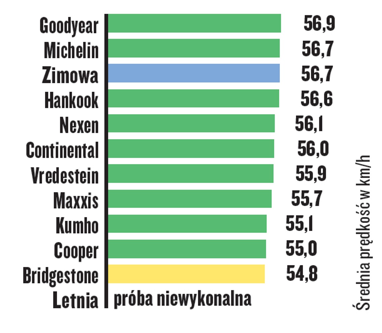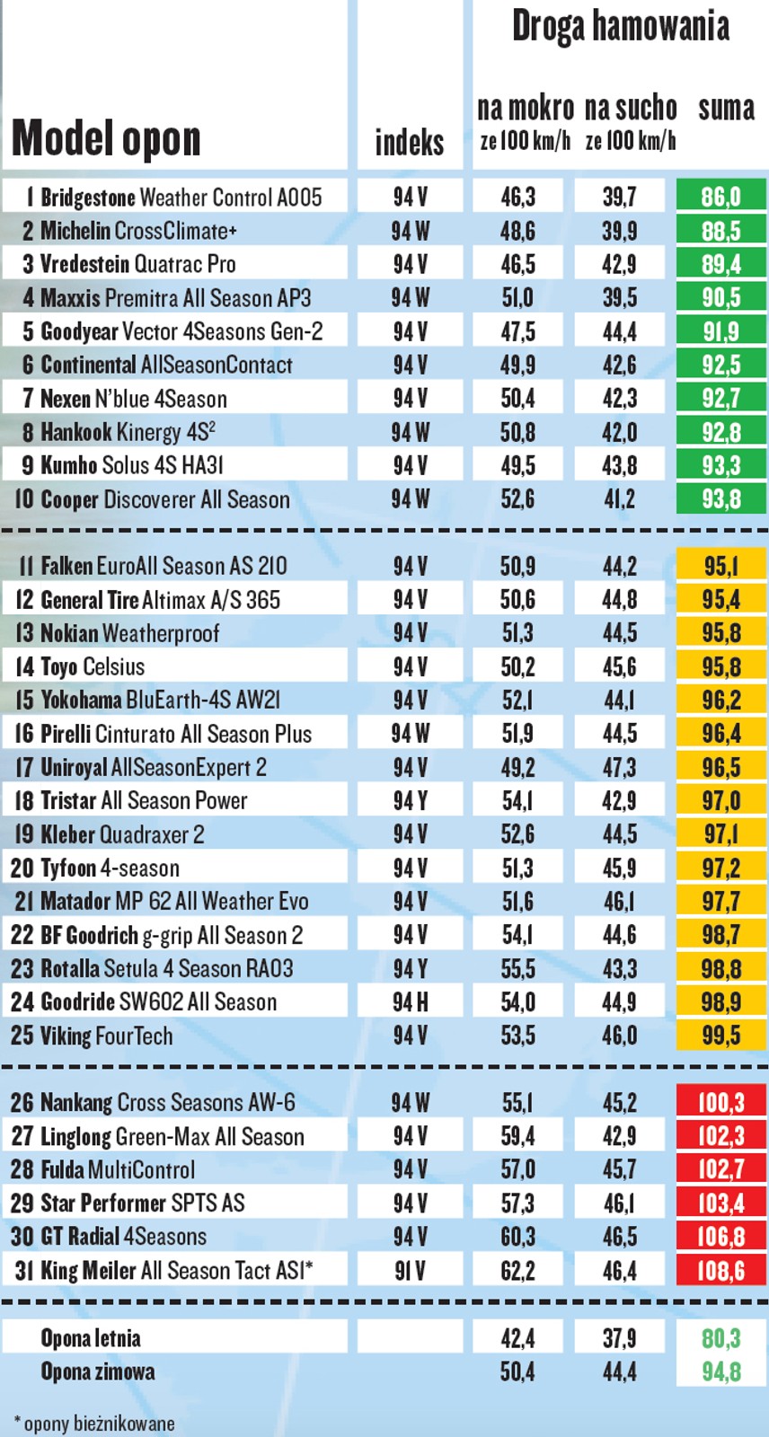 2/20 Eliminacje dla 31 kandydatów, czyli próba hamowania na suchej i mokrej nawierzchni z prędkości 100 km/h Wszystkie modele opon, które udało nam się kupić dostały od nas szansę, żeby zaistnieć w teście. Jednak tylko 10 modeli przetestowaliśmy gruntownie, we wszystkich możliwych dyscyplinach. Modele zaznaczone na żółto, choć bez szans na podium, zapewniają akceptowalne wyniki w próbach hamowania – wyniki modeli zaznaczonych na czerwono są naszym zdaniem dyskwalifikujące.