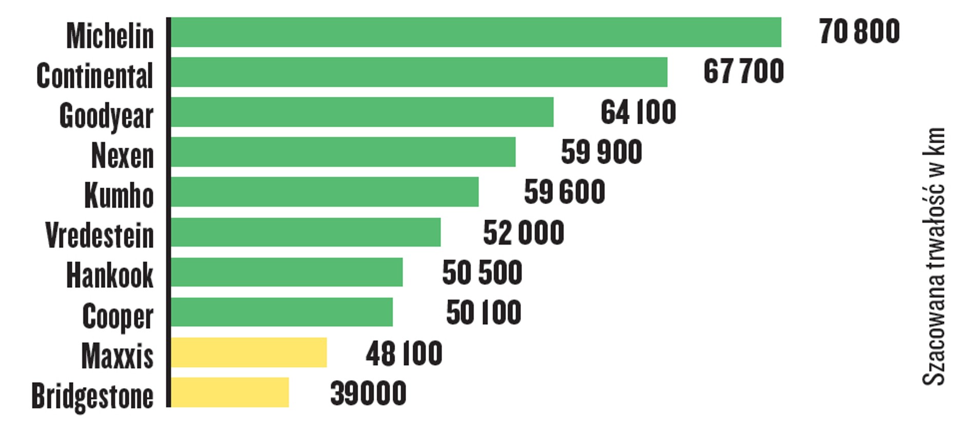 Jeśli ktoś pokonuje duże przebiegi, najlepszym wyborem będą dla niego opony marek Michelin oraz Continental, zapewniające ponadprzeciętną trwałość, opony marek Maxxis i Bridgestone zużywają się szybciej.