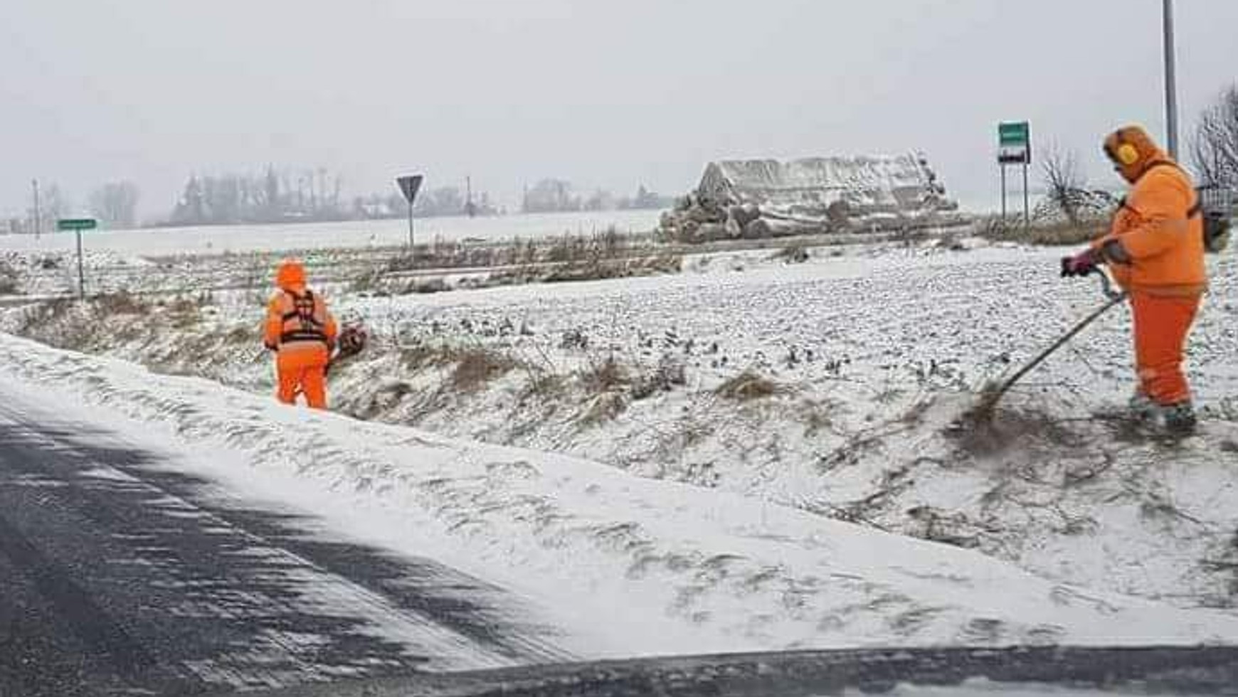 Jeden z kierowców wysłał zdjęcia tego niecodziennego widoku do redakcji „Wasze Radio FM". Widać na nim pracowników w pomarańczowych, odblaskowych uniformach, którzy podkoszarkami wycinają resztki ususzonych i zamarzniętych chwastów, które ledwo wystają spod śniegu.