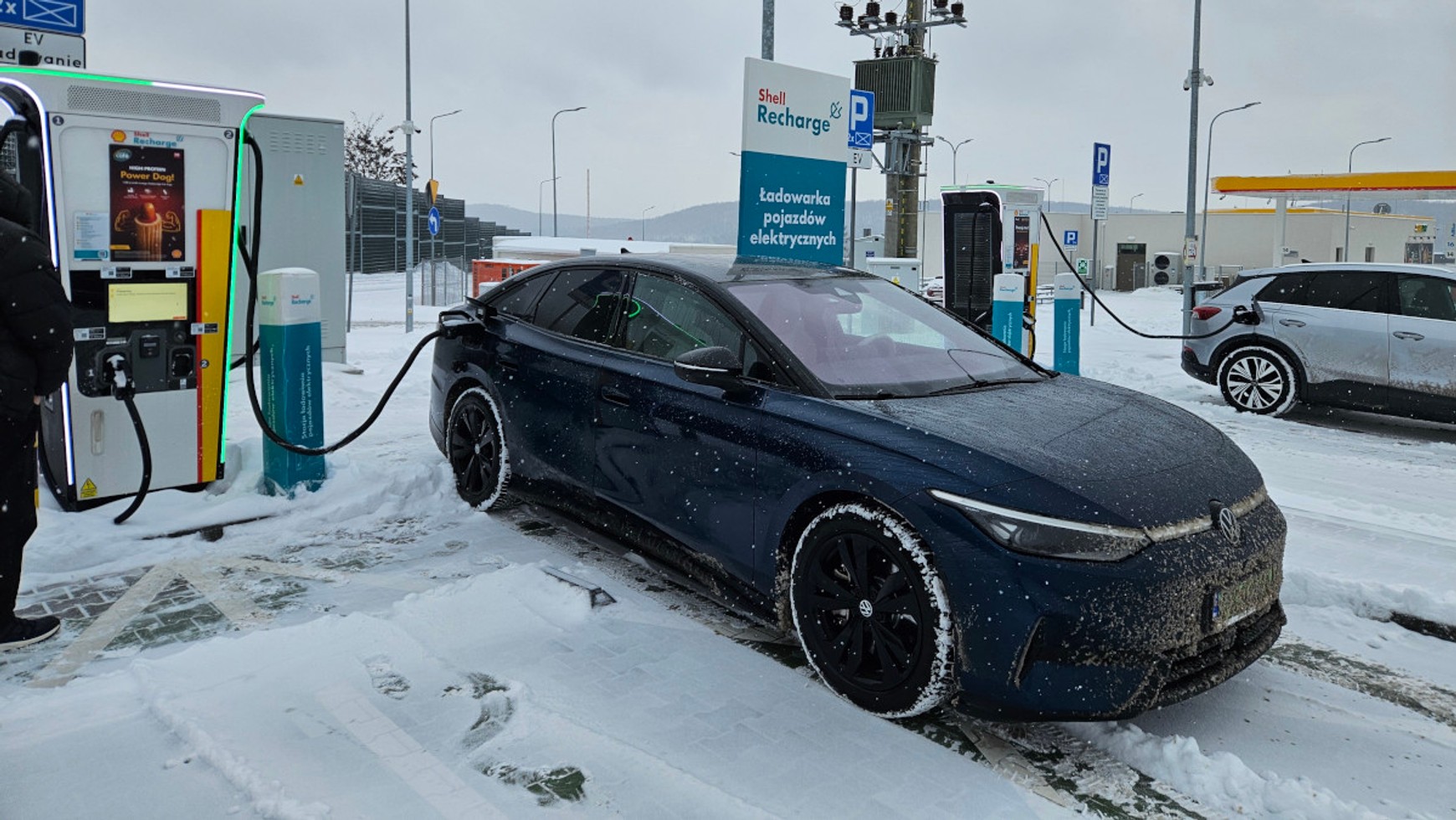 W gruncie rzeczy w zupełności wystarczyłoby jedno kilkunastominutowe ładowanie po drodze — przy okazji przerwy na kawę i toaletę — ale postanowiliśmy "dla nauki" zatrzymać się dwa razy. Drugim celem pośrednim była szybka ładowarka (hub sieci Ionity z 6 punktami oferującymi do 350 kW mocy), na której chcieliśmy sprawdzić, czy w mroźny dzień da się uzyskać obiecywaną moc ładowania.