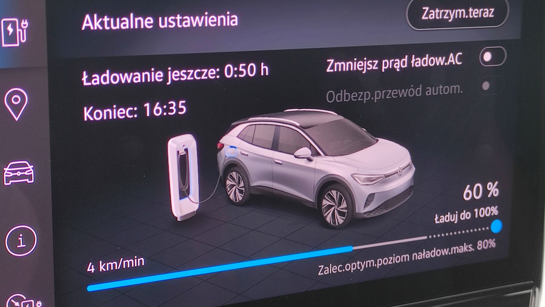 - W wielu autach elektrycznych, w menu ładowania komputera pokładowego można znaleźć opcję ograniczenia poziomu naładowania.