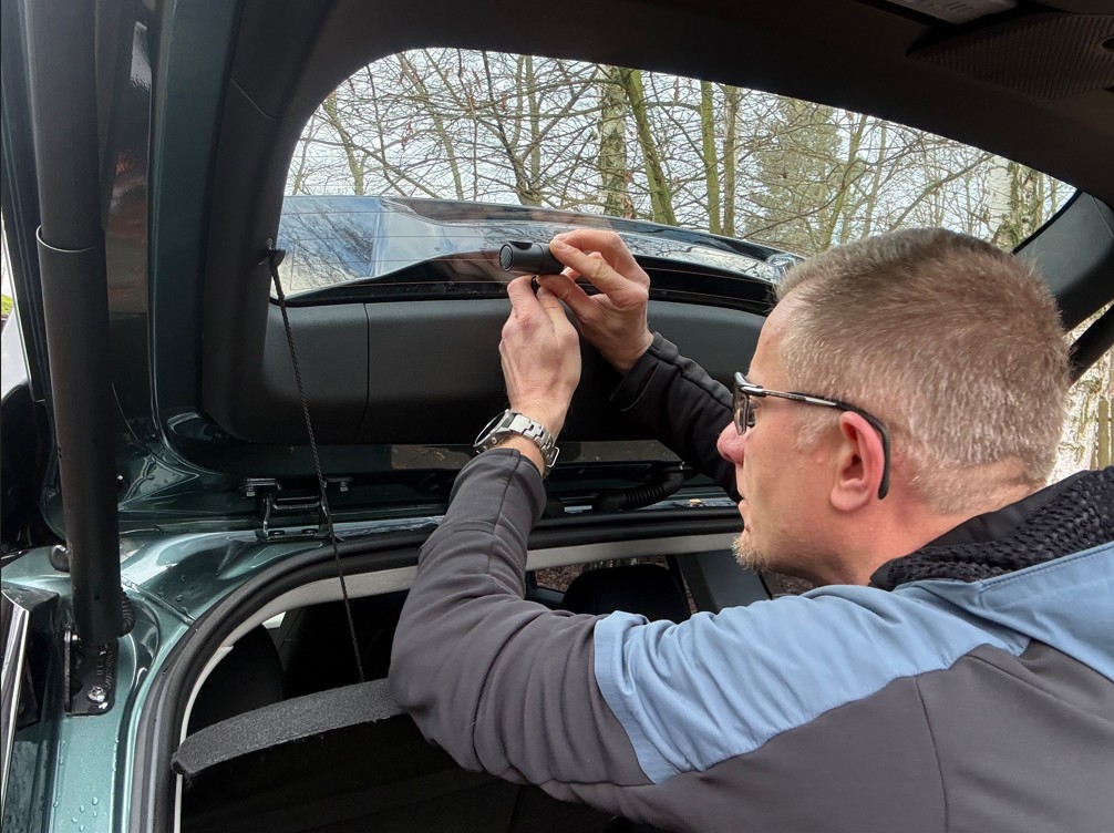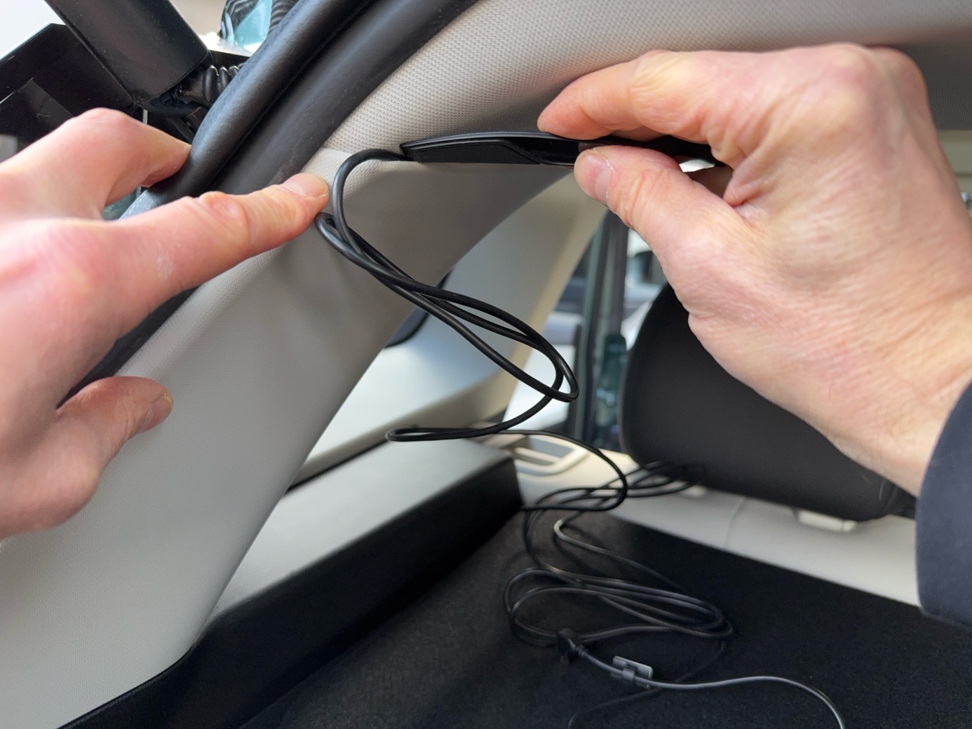 Zazwyczaj kabelek z łatwością mieści się pomiędzy podsufitką a szybą samochodu — wystarczy bardzo delikatnie odsunąć krawędź podsufitki, wsunąć tam kabel — i poprowadzić go tak aż do słupka. Następnie przewód trzeba ukryć pod osłoną przedniego słupka — również trzeba go tam wepchnąć. Na każdym etapie prac może przydać się plastikowa (koniecznie plastikowa albo drewniana, z pewnością nie metalowa) szpatułka albo inne narzędzie do delikatnego odchylenia plastikowych elementów.
