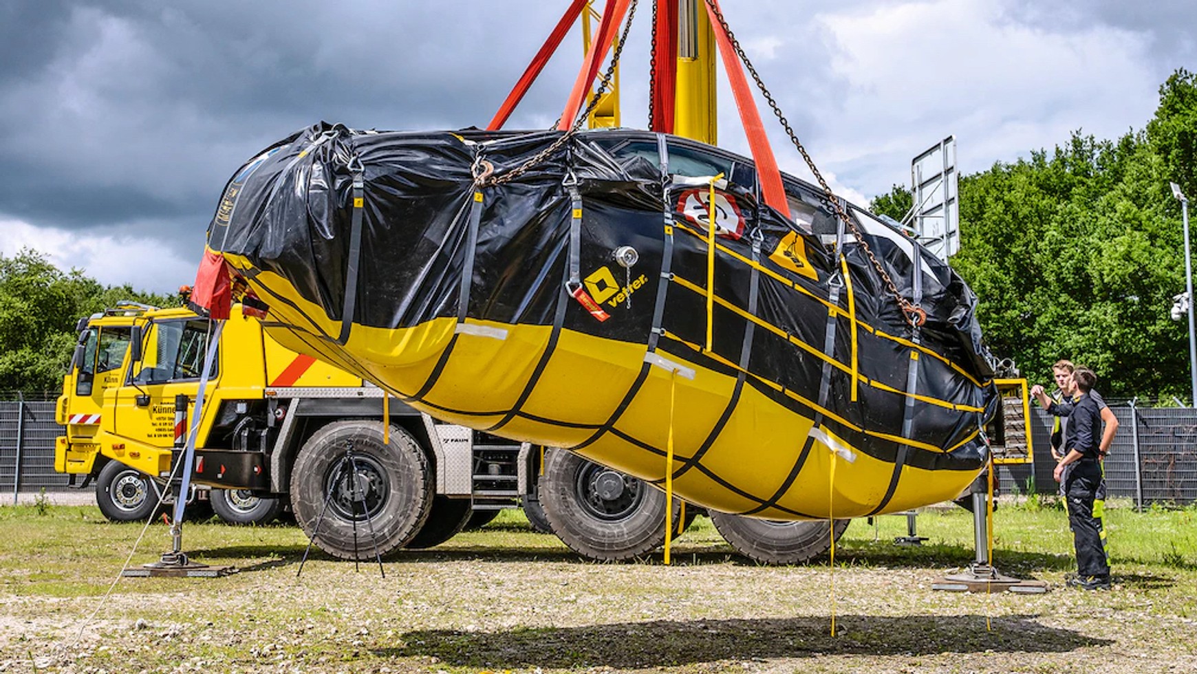 Umieszczenie w wodo— i ognioodpornym worku Volkswagena ID.3 z uszkodzonym przodem i odpalonymi airbagami zajmuje dobre pół godziny. Teraz ważąca 4,5 tony paczka (poza samochodem jest w niej 2 tys. litrów wody) za pomocą dźwigu jest podnoszona na lawetę. Gdyby działo się to na autostradzie, laweta odwiozłaby ten pakunek do umówionego warsztatu. Jest to jednak pokaz, który odbywa się na poligonie w Meppen w Dolnej Saksonii.
