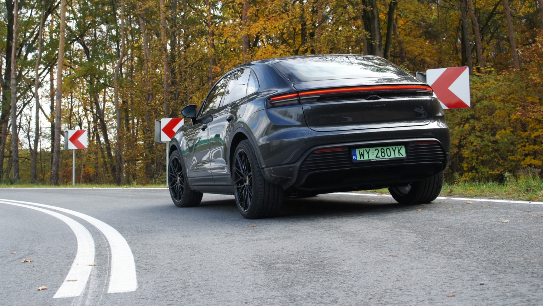 Uwaga, teraz będzie wątek heretycki — według mnie dzięki elektryfikacji Porsche Macan ma jeszcze lepsze właściwości jezdne. Zachwycił mnie już spalinowy poprzednik, a tu jest jeszcze lepiej dzięki niżej umieszczonemu środkowi ciężkości. Spory akumulator (100 kWh brutto) odbił się, co prawda, na wadze Macana, ale jednocześnie sprawił, że SUV trzyma się teraz drogi jak przyssany, a to zachęca do agresywnego atakowania zakrętów. Tylko ostrożnie z wciskaniem gazu, bo mimo napędu 4x4 testowane Porsche Macan 4 potrafiło czasami delikatnie wyjechać tyłem. Nie mam mu tego za złe, bo dostarcza to niemal "hothatchowej" frajdy z jazdy.