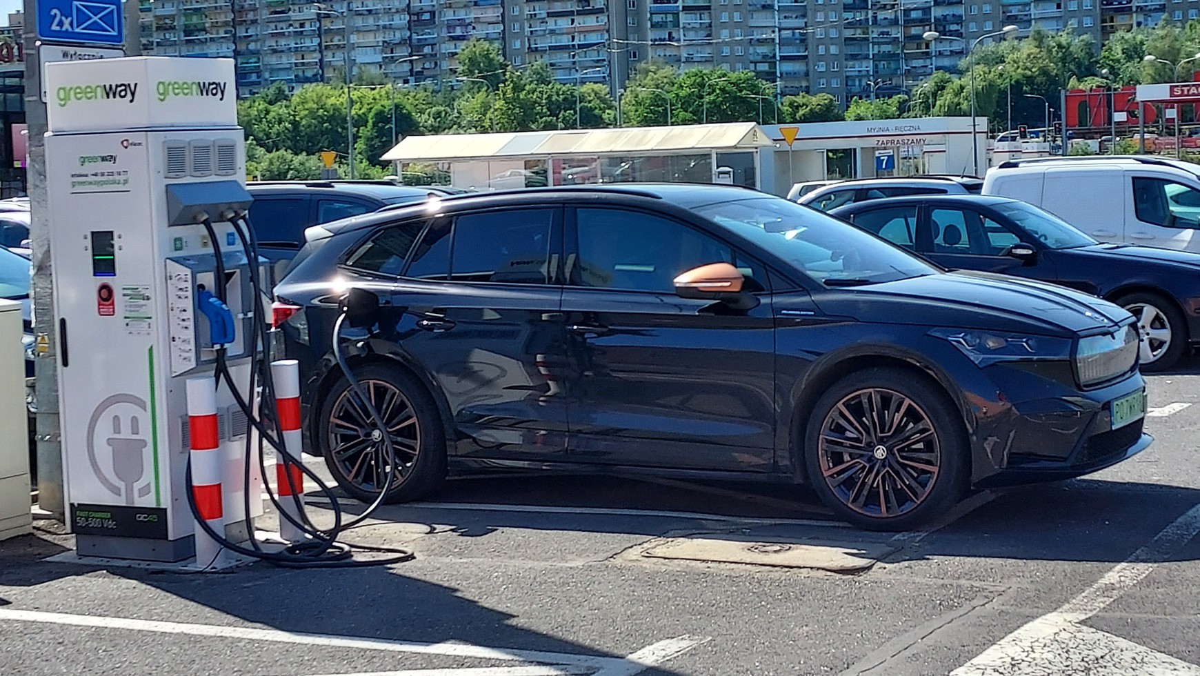 Skoda Enyaq to auto w formacie, który powinien zadowolić nawet duże rodziny. Podróż tym samochodem jest bardzo przyjemna, a i postój przy ładowarce, o ile trafimy na taką, która ma moc 125 kW, nie będzie trwał wiecznie. Zasięg na autostradzie przy prędkości 130 km/h to 318 km.
