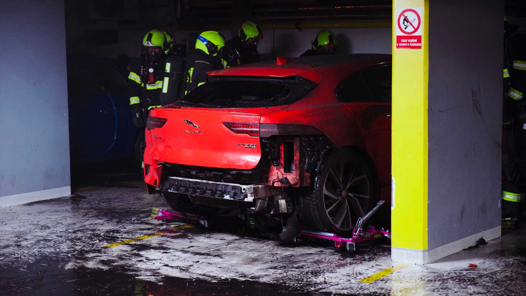 W miniony czwartek 4 maja doszło tam do zapłonu Jaguara I-Pace, który znajdował się na poziomie –1 w zamkniętym garażu podziemnym. Strażacy zaopatrzeni w maski tlenowe zaczęli gasić samochód z każdej możliwej strony, głównie wlewając wodę do środka. Następnie podnieśli Jaguara na podnośniku hydraulicznym, specjalnym urządzeniem Cobra przebili obudowę akumulatora, co umożliwiło jego bezpośrednie gaszenie. W międzyczasie chemicy kontrolowali natężenie zanieczyszczeń w powietrzu. Pobrano także próbki wody gaśniczej do dalszych badań na obecność chemikaliów.
