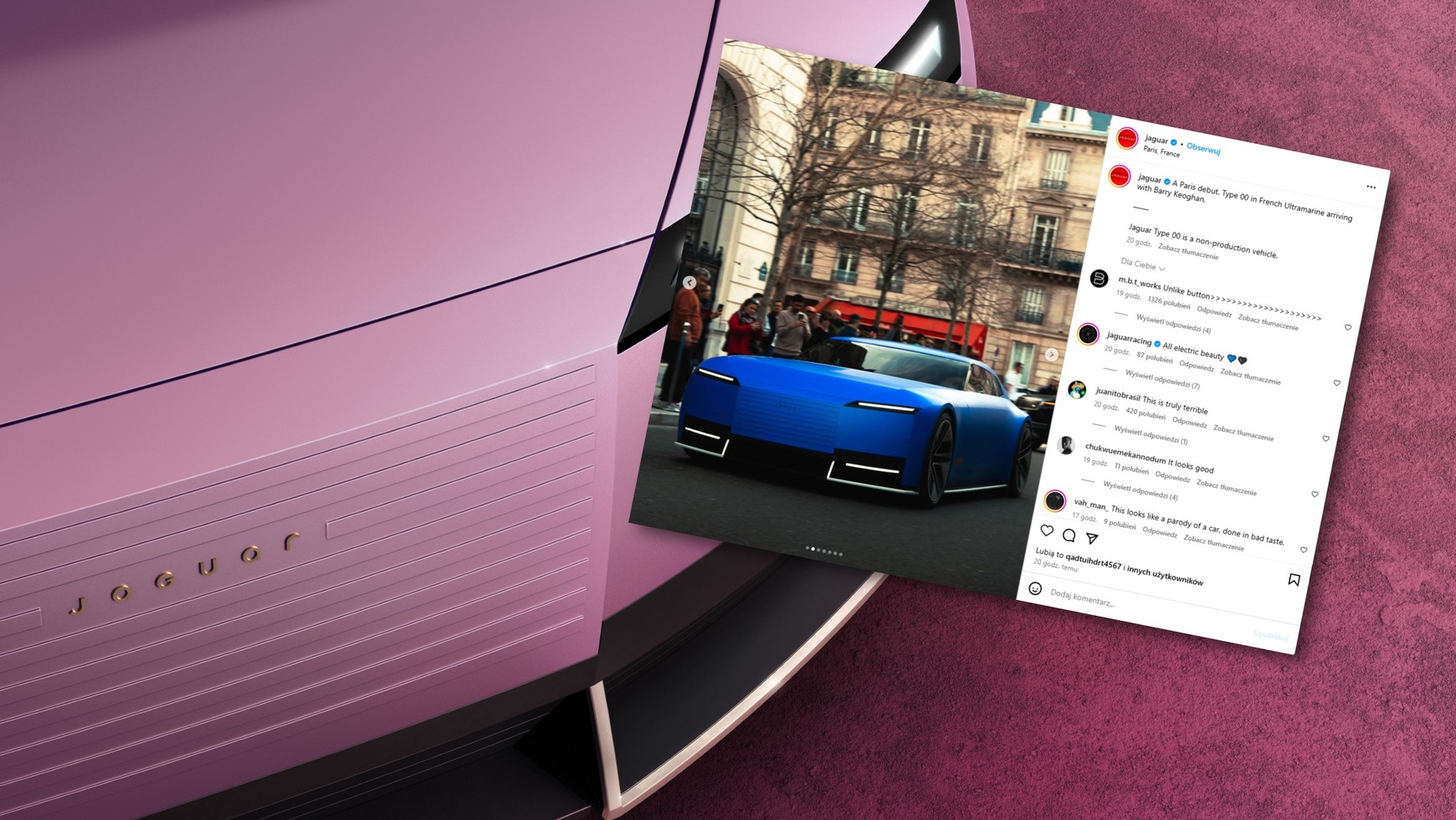 Jaguar pokazał bowiem swój koncept w realnym otoczeniu, poruszający się po prawdziwych ulicach, podczas Paris Fashion Week. Auto na żywo nadal "zdumiewa" swoim nietypowym wyglądem. Matowe, niebieskie nadwozie w kolorze French Ultramarine prawie nie odbija światła. Dodatkowo auto celowo pozbawione jest wielu zewnętrznych elementów. Ten minimalizm sprawia, że auto wygląda sztucznie, jakby było tylko słabej jakości renderem, nałożonym na nagranie paryskiej ulicy.