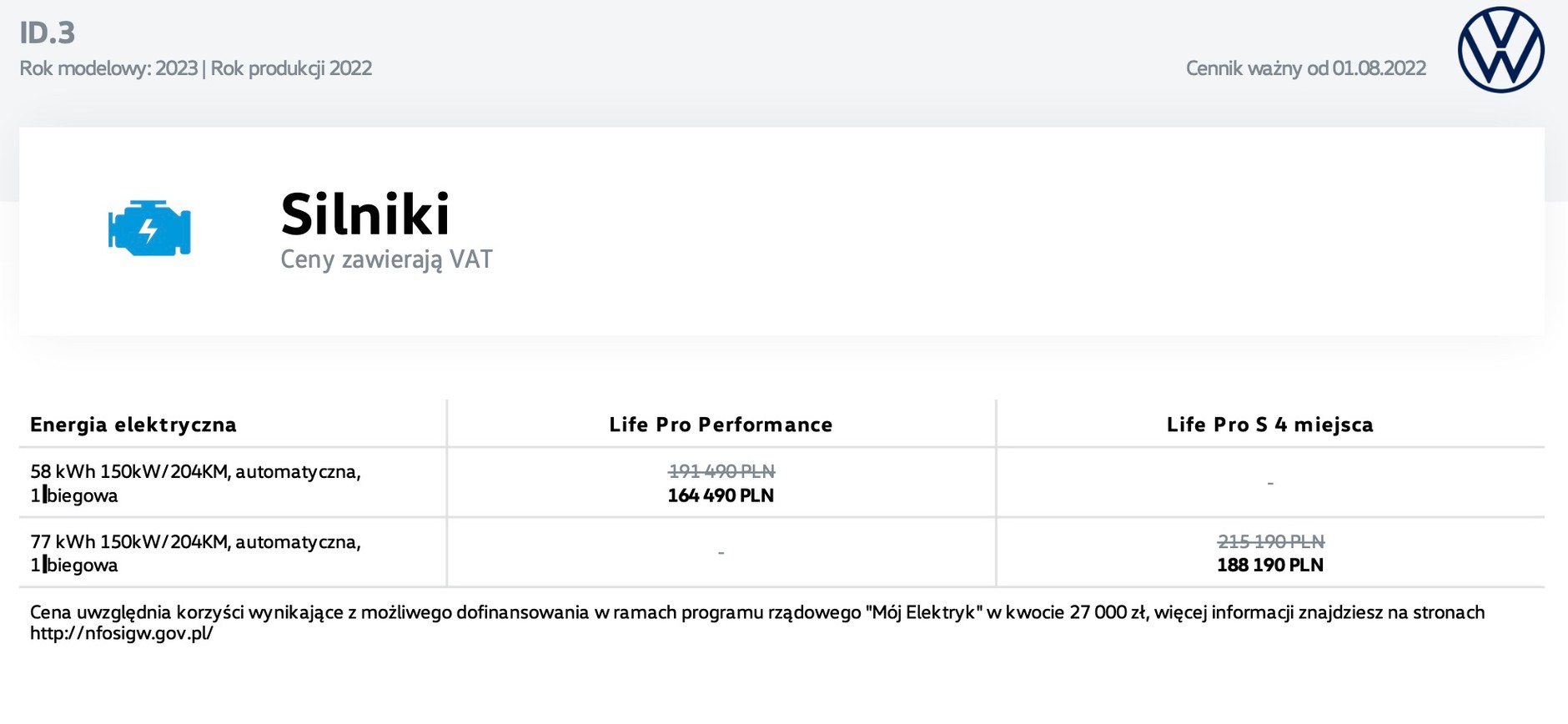 Volkswagen ID.3 rok temu: od 166 290 zł. ID.3 dziś: od 191 490 zł. Gdyby porównywać wersje o tej samej nazwie (Life Pro Performance) różnica byłaby mniejsza, bo rok temu ta wersja kosztowała 170 190 zł. Tu ciekawostka: Volkswagen w aktualnym cenniku stosuje trik, który na pierwszy rzut oka niweluje podwyżkę. Wyższa cena 191 490 zł jest przekreślona i ledwie widoczna, obok wyraźną czcionką wstawiono niższą: 164 490 zł. Kiedyś to oznaczało promocję cenową, a dziś… w ten sposób importer informuje, że posiadacz Karty Dużej Rodziny może liczyć na rządową dopłatę w wysokości 27 tys. zł. Jakby jednak nie liczyć, bazowa cena elektrycznego Volkswagena wzrosła w ciągu roku o 15 proc. Po co to ukrywać, skoro dziś nawet najtańszy widoczny w cenniku Nissan Leaf z małą baterią kosztuje 145 900 zł?