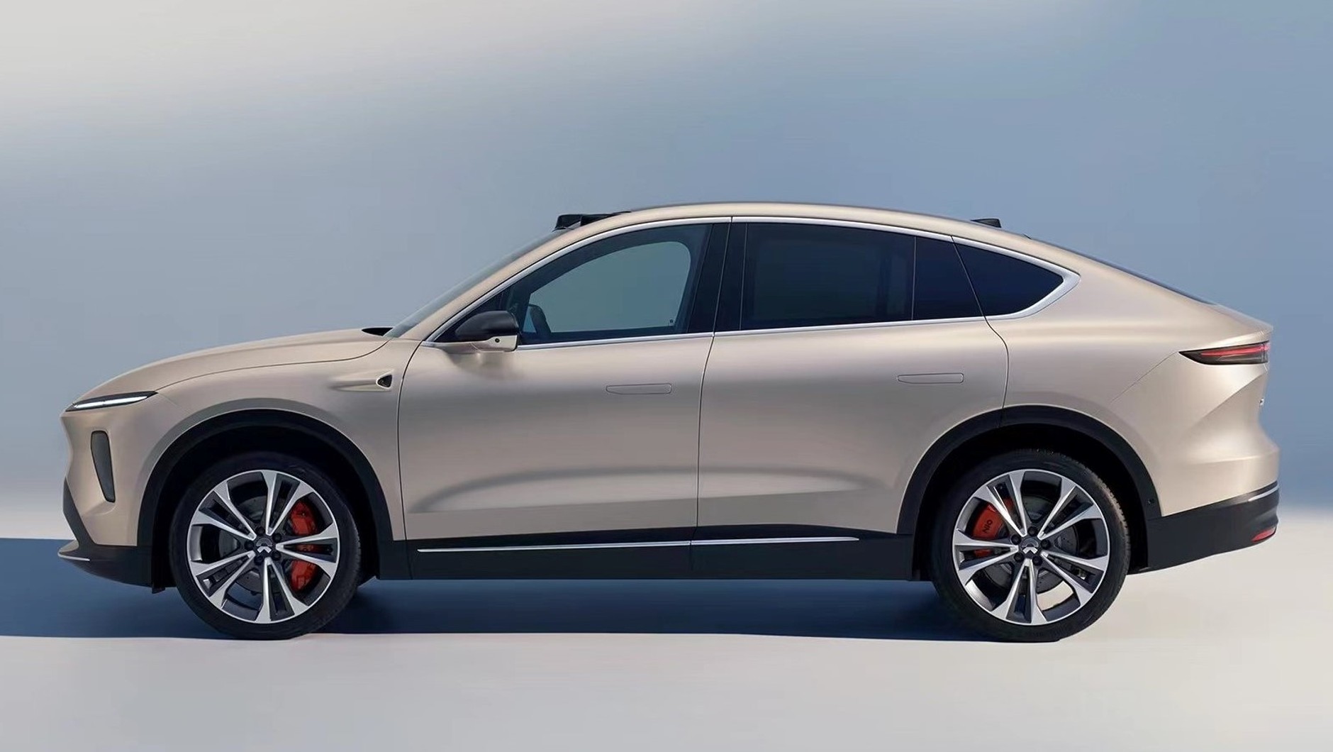 Klamki NIO EC7 po użyciu chowają się w nadwoziu, słupki B i C tworzą z oknami jedną płaszczyznę, a tylny spoiler jest aktywny.