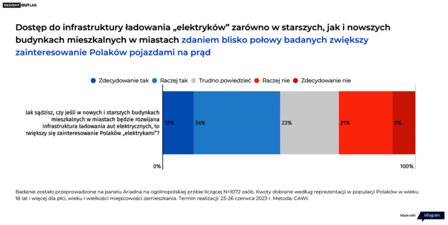 Zdaniem 46 proc. ankietowanych, dostęp do infrastruktury ładowania pojazdów elektrycznych w starszych i nowszych budynkach mieszkalnych w miastach zwiększy zainteresowanie Polaków samochodami na prąd. Niemal co czwarty badany nie wyraża w tej sprawie opinii. Natomiast 30 proc. badanych uważa, że rozwijanie infrastruktury ładowania aut elektrycznych w blokach nie wpłynie na większe zainteresowanie pojazdami elektrycznymi wśród Polaków.