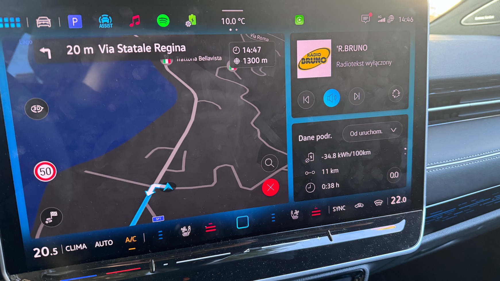 Po zjeździe z góry i poruszaniu się po płaskim terenie udało się osiągnąć zużycie na poziomie 3,5 kWh/100 km. Taki wynik po 43 km daje szanse na bardzo niskie zużycie na 100 kmŹródło: Auto Świat