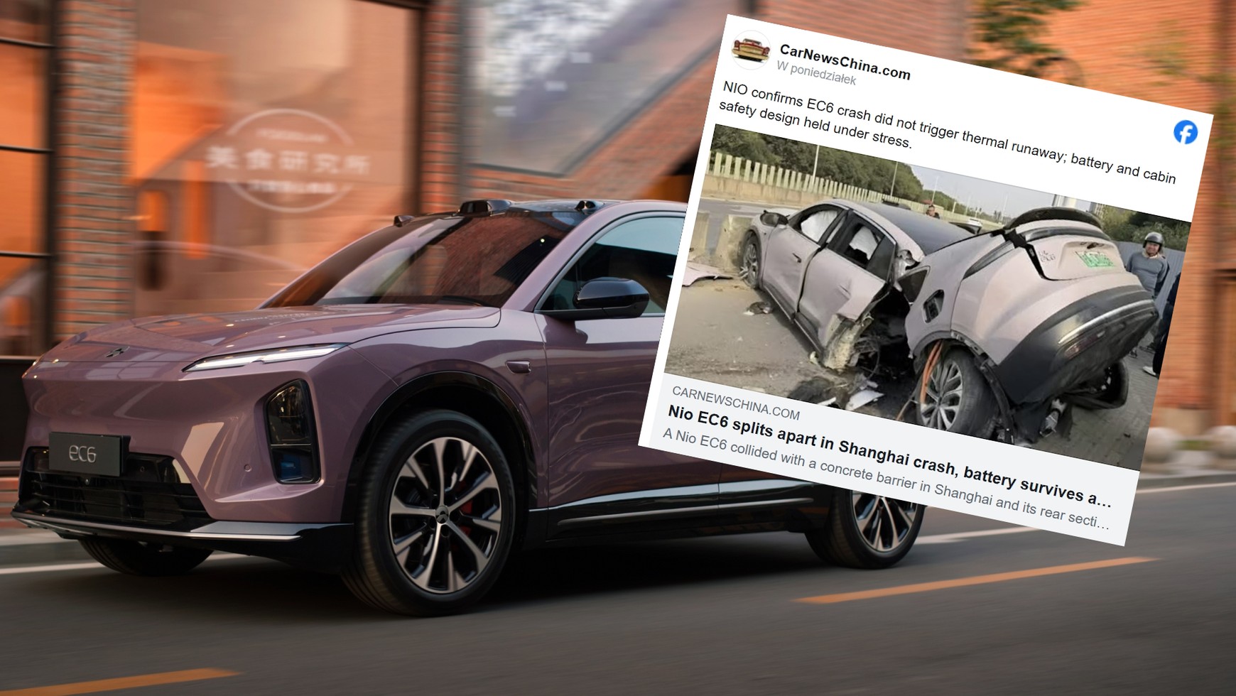 Elektryczny SUV Nio EC6 1 grudnia na przedmieściach Szanghaju uderza w betonową barierę. Podobno kierowca jechał bardzo szybko (prędkość w chwili wypadku nie została oficjalnie potwierdzona). Nio twierdzi, że to dlatego (i z powodu nietypowego kształtu bariery) doszło do rozczłonkowania nadwozia. Podróżujące samochodem dwie osoby zostały przewiezione do szpitala. Obrażenia, które odnieśli, nie zagrażają ich życiu.
