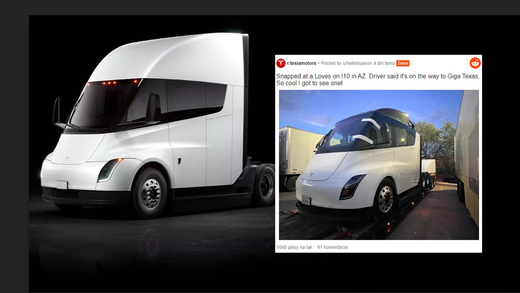 Druga ciężarówka znaleziona została na drodze I-10 w Arizonie przez użytkownika Reddita o nicku u/helloiisjason. Jak podaje internauta, laweta z modelem kierowała się w stronę fabryki Tesli w Teksasie. W tym przypadku zapomniano o czarnej folii na przedniej szybie, dzięki czemu dostrzec można fragment wnętrza i umiejscowienie kierownicy.