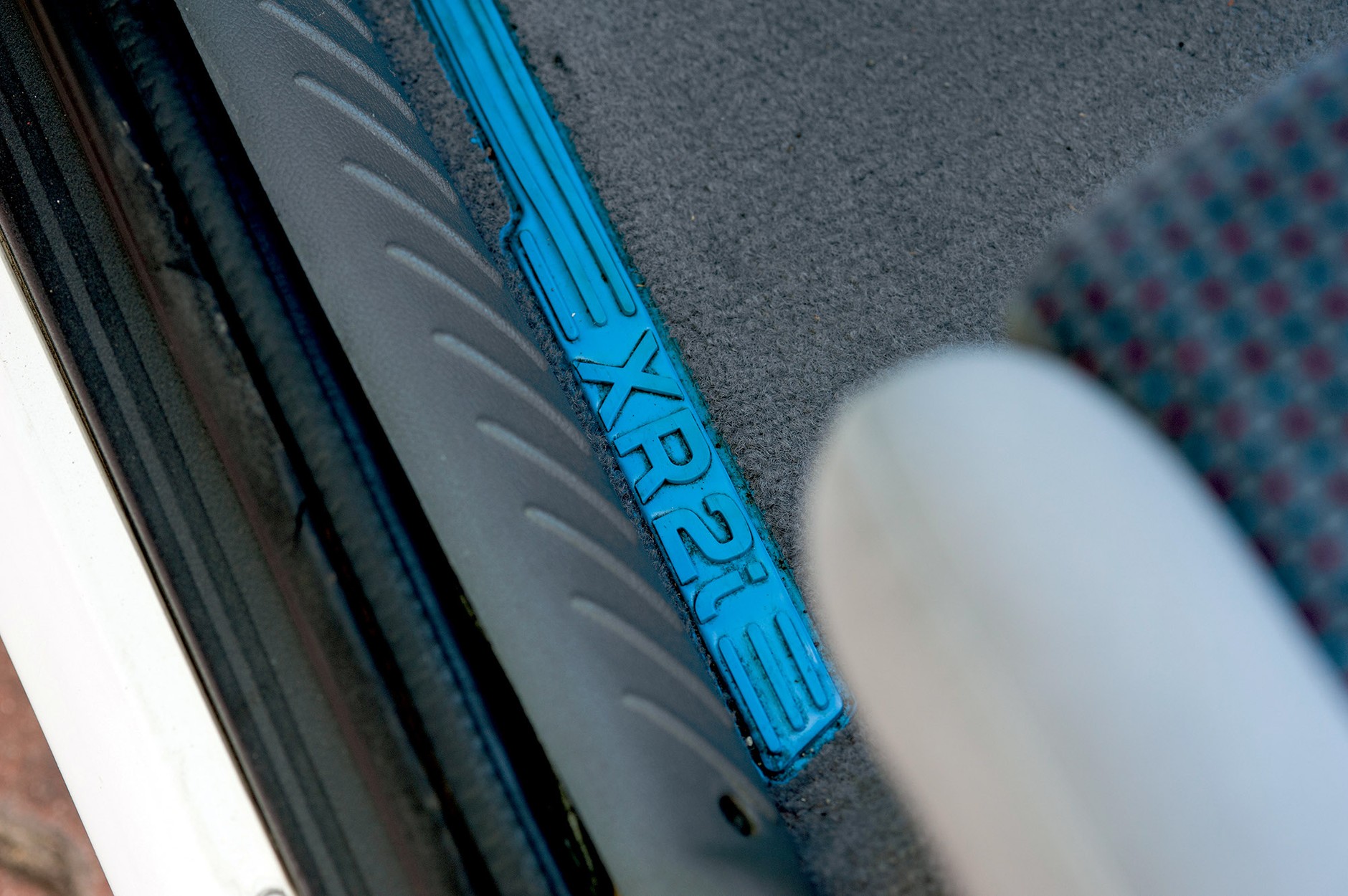 Cienka niebieska linia. Pamiętacie? Serial komediowy o perypetiach grupy nieudaczników, pardon, brytyjskich policjantów, pod wodzą inspektora Raymonda C. Fowlera, w którego wcielił się Rowan Atkinson. Ale nas bardziej interesuje inna niebieska linia, ta, która odróżnia Fiestę XR2i od jej cherlawego rodzeństwa. Biegnie wokół nadwozia, nad szerokimi listwami progowymi i nadkolami, obejmując masywne zderzaki. Kontynuację ma w środku – na tapicerce drzwi, gumowych listwach ozdobnych w podłodze, tu już z oznaczeniem modelu. Towarzyszy jej „rozpiska” w tym samym kolorze znajdująca się na gałce dźwigni zmiany biegów.