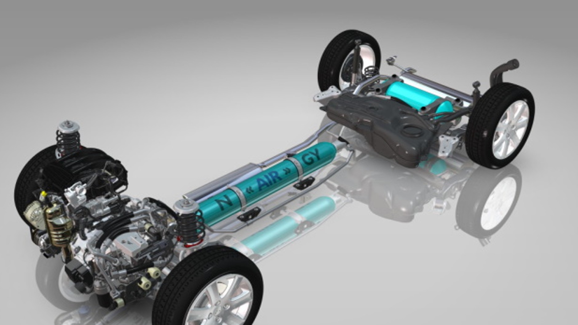 Tryb powietrzny Gdy Tryb Powietrzny jest aktywowany, to działa on w identyczny sposób jak tryb ZEV samochodów hybrydowych. Silnik cieplny nie pracuje. Zgromadzona energia (sprężone powietrze) jest przekazywana na koła poprzez silniki hydrauliczne i skrzynię biegów. W zależności od napotkanego natężenia ruchu, 60 do 80 % czasu jazdy w mieście będzie się odbywało w tym trybie. Maksymalne wykorzystanie opóźnień i hamowań pozwoli na skuteczne doładowanie zapasu sprężonego powietrza. Ten tryb jest aktywny aż do 70 km/godz.