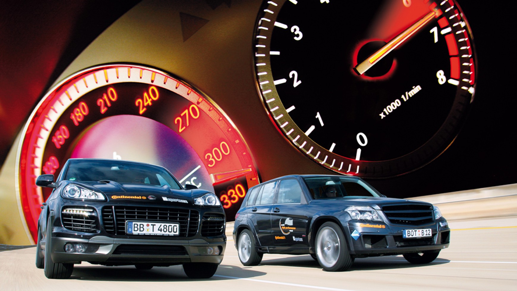 TechArt szybko kontruje – Cayenne w czasie pierwszej próby rozpędza się do 320 km/h. Na czole pilota Sandro Reutera nie pojawia się nawet kropla potu. Również Porsche sprawuje się bez problemów.Oczywiście Brabus żąda drugiej próby. Wykorzystuje życzliwość późnych godzin dnia, a z tego tytułu niższej temperatury otoczenia, która jest przecież bardziej przyjazna dla turbosprężarki. GLK podwyższa wynik do 322,3 km/h!