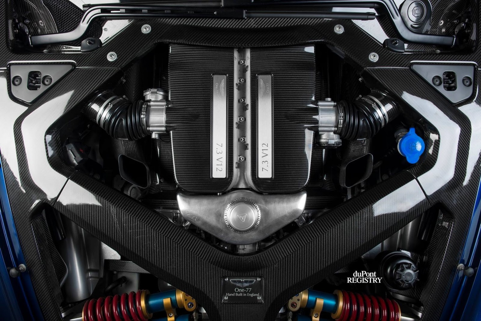 Brytyjskie superauto z 2012 roku znajduje się w ofercie duPont Registry. Ma niebieski lakier nadwozia, w podobnym odcieniu felgi i granatowe wykończenie wnętrza. Sercem Astona One-77 jest silnik V12 o pojemności 7.3 litra (AM77/089), który rozwija 750 KM i 750 Nm. Rozpędza model od 0 do 100 km/h w 3,5 sekundy, a prędkość maksymalna wynosi 354 km/h.
