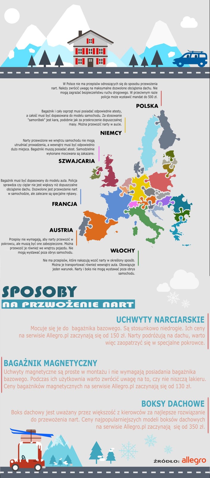 - W okresie wyjazdów zimowych wiele osób staje przed dylematem: w jaki sposób przewieźć bezpiecznie wszystkie bagaże. O ile spakowanie do naszego samochodu zwykłych walizek i toreb nie powinno nam nastręczyć większego problemu, o tyle problem może pojawić się w sytuacji, kiedy chcemy przewieźć narty lub deskę snowboardową - wyjaśnia Robert Krotoski, manager kategorii "Motoryzacja" w serwisie Allegro.pl - Sporo kierowców decyduje się na przewożenie sprzętu narciarskiego wewnątrz kabiny. Warto pamiętać, że takie rozwiązanie nie należy do najbezpieczniejszych - dodaje.
