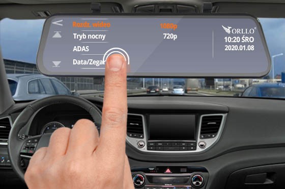 Mówiąc o wyświetlaczu zwróćmy uwagę na jego wielkość. W modelu ORLLO LX-50 DUAL znajdujemy wyświetlacz o przekątnej ok. 10 cali w proporcji 16:9, co czyni go jednym z największych dostępnych na rynku. Ekran tej wielkości wypełnia całe lusterko, dzięki czemu obraz jest wyraźny i czytelny. Został wykonany w technologii IPS, posiada powłokę antyrefleksyjną, dlatego patrząc nawet pod kątem widzimy, co wyświetla. Urządzenie możemy wygasić za pomocą jednego przycisku, bo tylko jeden posiada. A to dlatego, że wyświetlacz jest dotykowy! Ikony na wyświetlaczu są duże i łatwo jest zrobić zdjęcie podczas nagrania lub zabezpieczyć plik. Intuicyjne, polskie menu zdecydowanie ułatwia korzystanie z kamery.