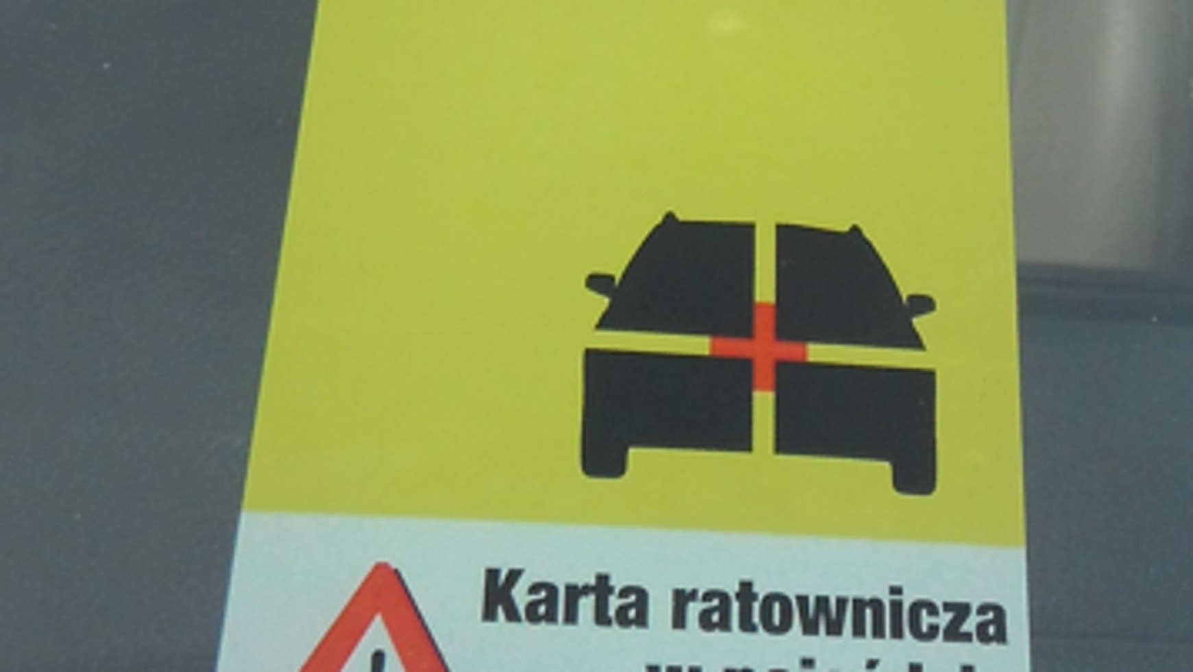 Jeśli w samochodzie jest karta bezpieczeństwa (powinna być umieszczona w osłonie słonecznej po stronie kierowcy), to informuje o tym żółta nalepka na przedniej szybie w lewym dolnym rogu.