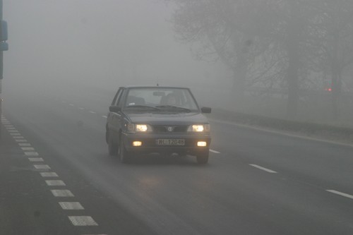 Światła mijania z trudem przebijają się przez mgłę. Widoczność jest wtedy ograniczona do kilkudziesięciu, a czasami do zaledwie kilku metrów.