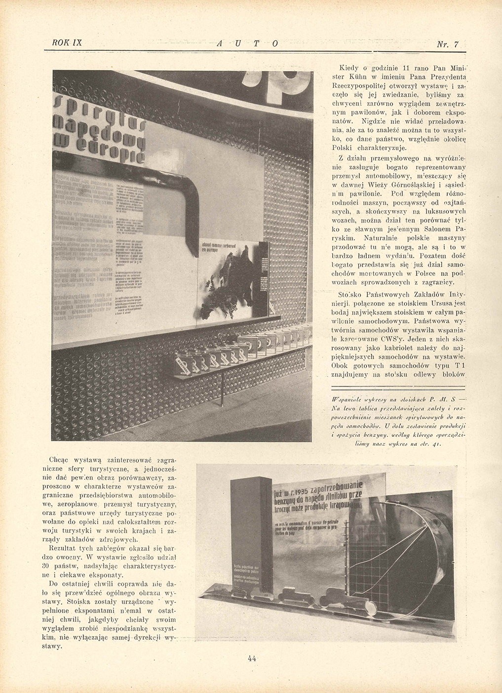 Dużo uwagi w opisie wystawy poświęcono stoisku Państwowego Monopolu Spirytusowego, gdzie prezentowana była aparatura do wyrobu odwodnionego spirytusu – głównego składnika mieszanki do napędu silników spalinowych.