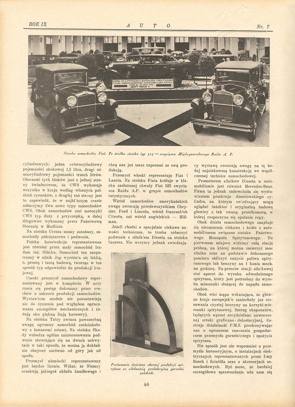 W relacji z wystawy miesięcznika „Auto” autor zwracał uwagę na nowość – podwozie z silnikiem Diesla. Była to zapowiedź samochodu osobowego z silnikiem wysokoprężnym. Jednak masowa produkcja osobówek z dieslem pod maską ruszyła dopiero w 1936 roku (Mercedes 260 D).