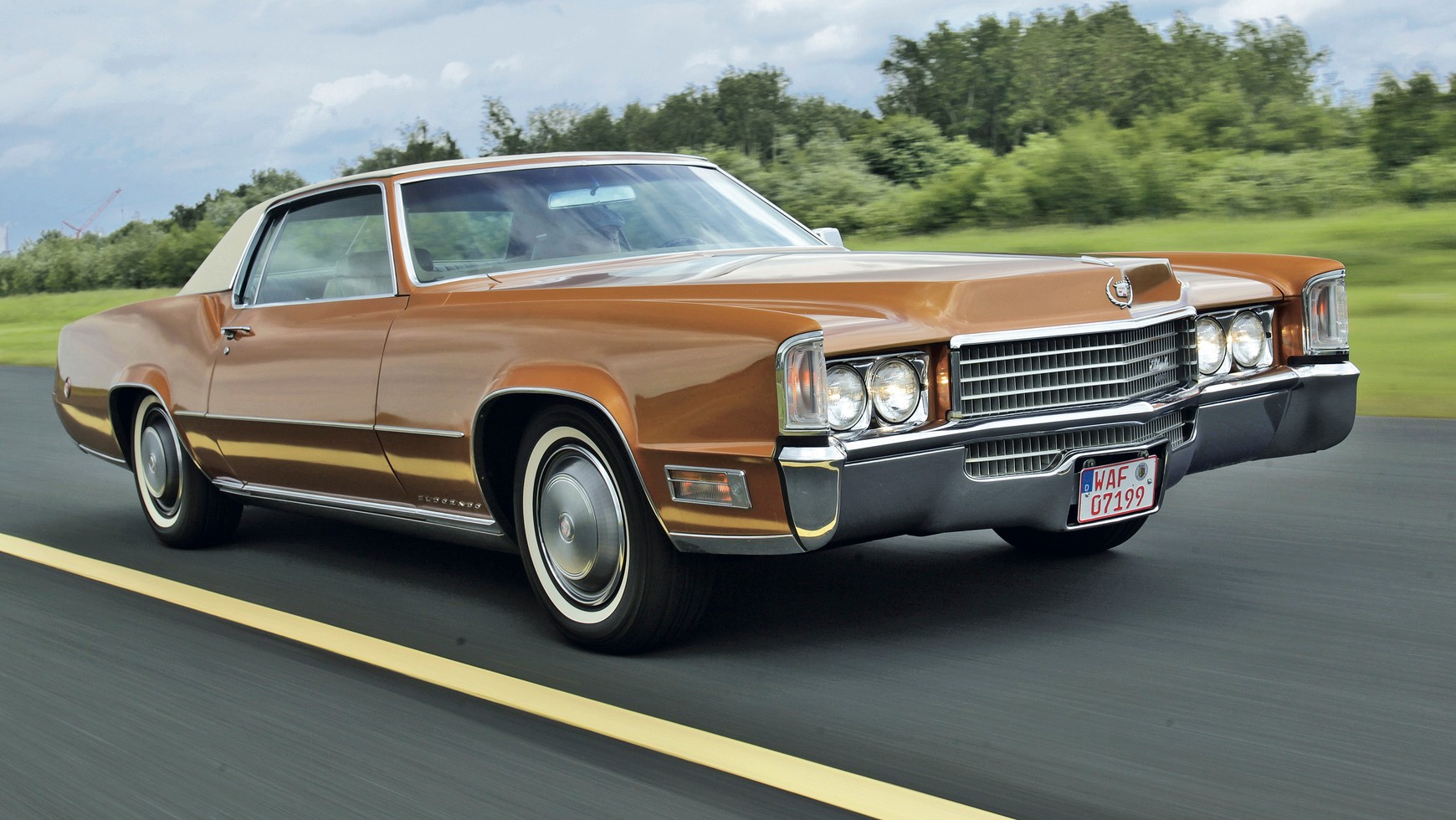 Dane techniczne Cadillac Eldorado (1970): silnik V8, z przodu wzdłużnie, zawory/wałki rozrządu 16/1, napęd rozrządu łańcuch, pojemność 8194 ccm, średnica cylindra x skok tłoka 109,22 x 109,32 mm, maksymalna moc w kW (KM) przy obr./min 175 (238)/3800, maksymalny moment obrotowy w Nm przy obr./min 556/2400, prędkość maksymalna 200 km/h, skrzynia biegów automatyczna 3-przełożeniowa, napęd na przód, hamulce przód/tył tarcze/bębny, opony auta testowego 225/75 R 15 S, spalanie (fabryczne) 25 l/100 km, zbiornik paliwa 104 l, dopuszczalna masa całkowita 2650 kg.
