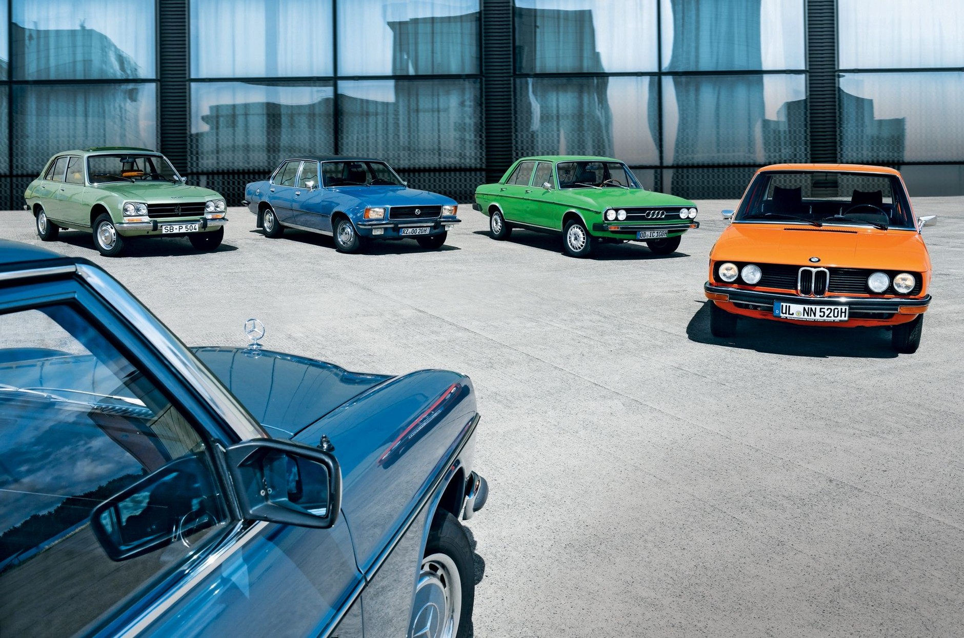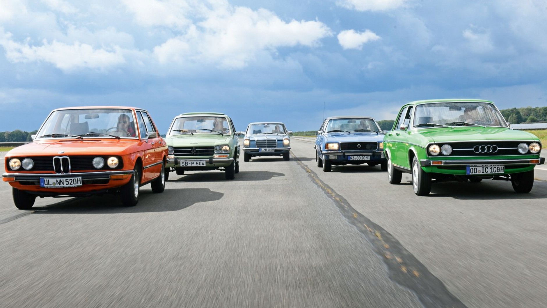 Dziś oba samochody znów stoją naprzeciw siebie. W obu przypadkach to późne egzemplarze: niebieski Mercedes 230.4 pochodzi z 1976 roku, a jaskrawo zielone Audi 100 GL z 1975 roku (wówczas było to topowe wydanie modelu). Oprócz nich na placu boju znalazły się BMW 520/4, Opel Rekord 2000 i Peugeot 504. Wszystkie te samochody są tu po to, by strącić z tronu Mercedesa. Ale czy na pewno są w stanie to zrobić? Przekonajmy się!