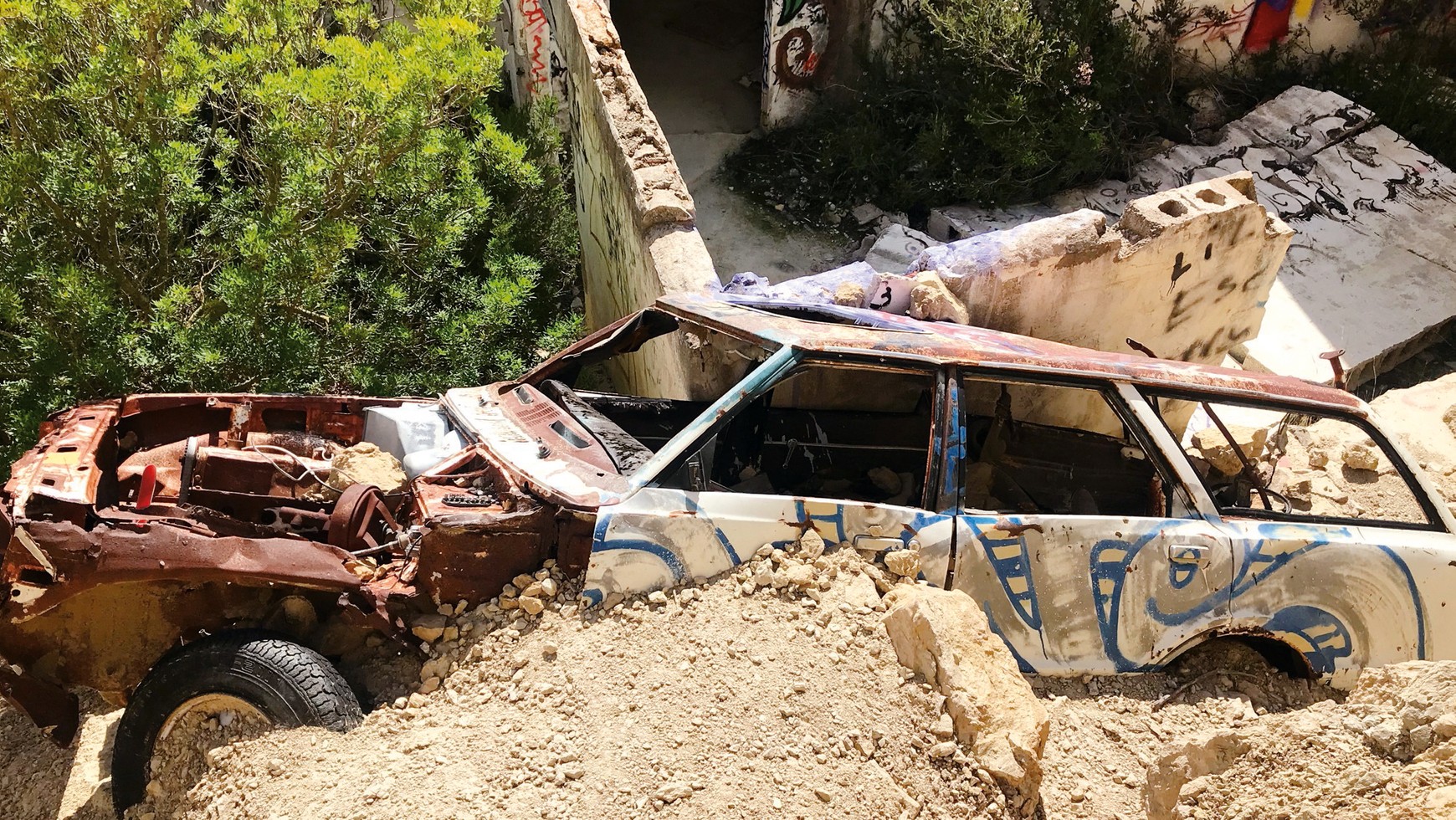 Słońce nad Ibizą stoi wysoko, świeci na kolorowego Forda Granada kombi zakopanego po linię okien w gruzie – i tak od ponad 40 lat. Kawałek dalej, w lesie, w cieniu pinii, chowa się wrak dawnego Suzuki Jimny. Auto jest zielone, co czyniłoby go wśród drzew prawie niewidocznym, gdyby jakiś graficiarz, chyba najgorszy na wyspie, nie pomalował go sprejem na żółto, zielono i różowo.