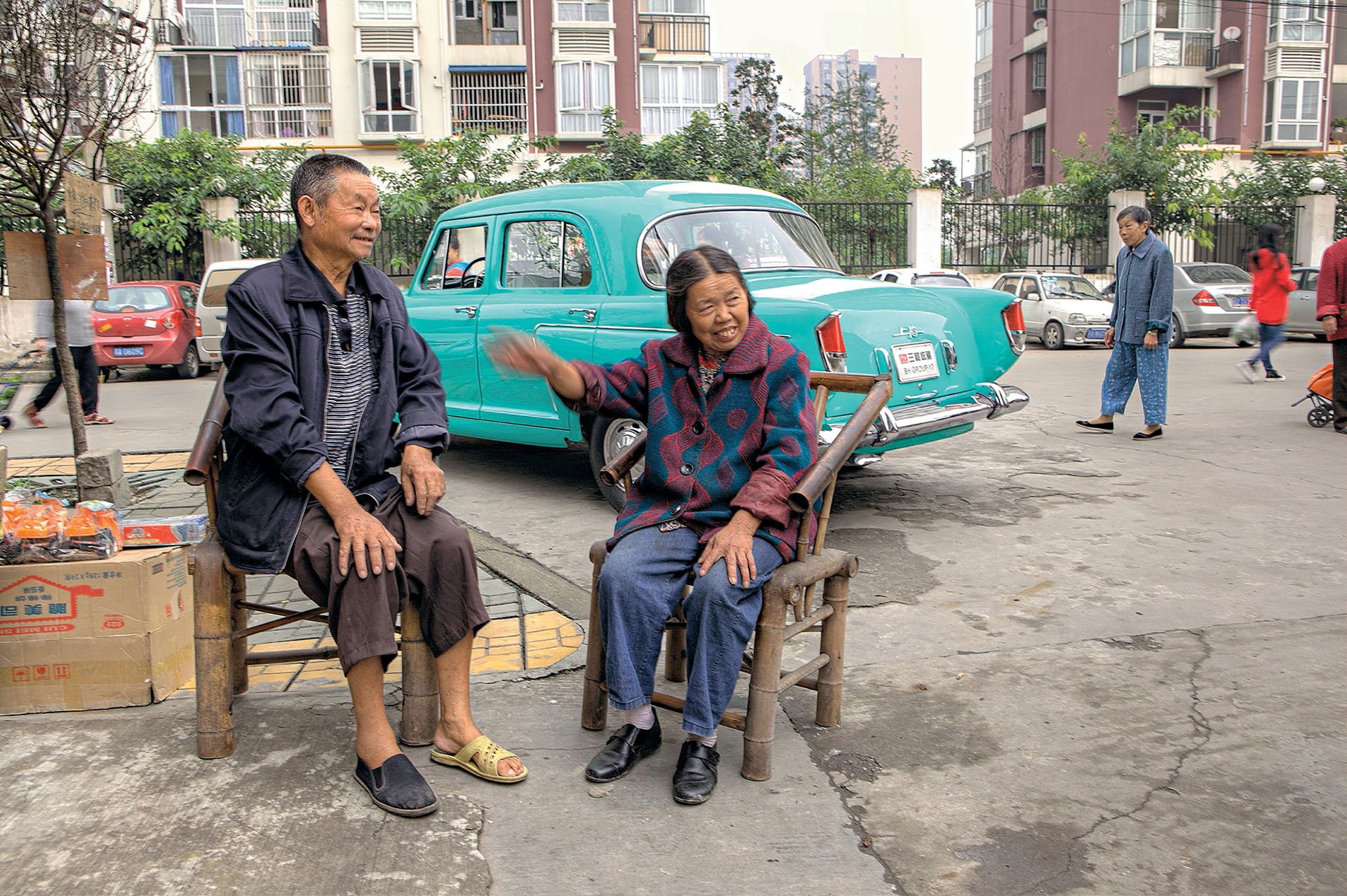Przy absurdalnych ruchach kierownicą limuzyna z mruczącym V8 z wolna posuwała się po małych uliczkach, na których trzeba uważnie omijać ręczne wózki, rowery i przede wszystkim pieszych, podczas gdy elektryczne skutery, których w Chengdu są dziesiątki tysięcy, przejeżdżały obok nas. Samodzielne prowadzenie auta nie ma uroku, no, chyba że lubi się przygody. Prawdę powiedziawszy, najlepsze miejsce do podróżowania tym autem znajduje się z tyłu – na rozłożonym ręczniku jest miękko, wygodnie, dużo miejsca...
