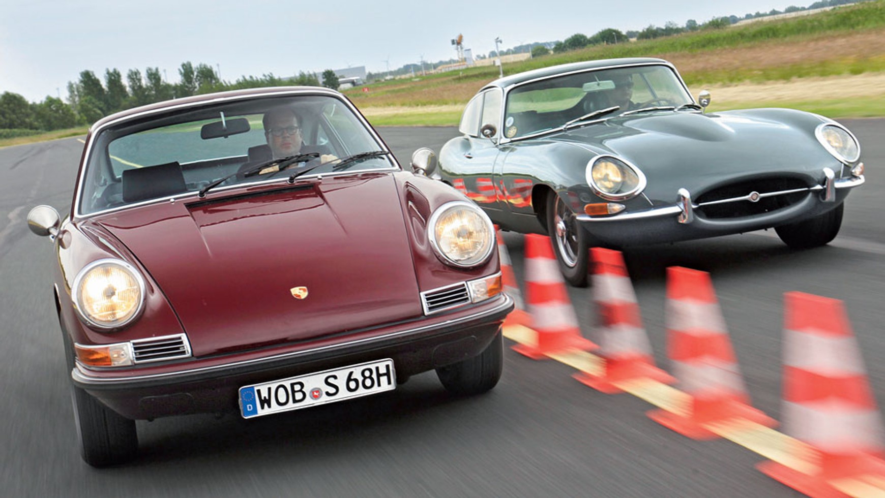 Konkurujące z Jaguarem Porsche 911 S ma dyszący z tyłu 2-litrowy silnik typu bokser z wtryskiem paliwa, o mocy 170 KM. Porsche musi swoją moc wykrzyczeć. Czerwone pole na obrotomierzu zaczyna się przy 7200 obr./min, blisko granicy wytrzymałości ludzkiego słuchu. Jednak pod względem dynamiki niemiecki sportowiec wyraźnie ustępuje E-Type’owi. Porsche osiąga „setkę” po 9,7 s, podczas gdy w Jaguarze z taką samą prędkością pędzi się już po 7,4 s.