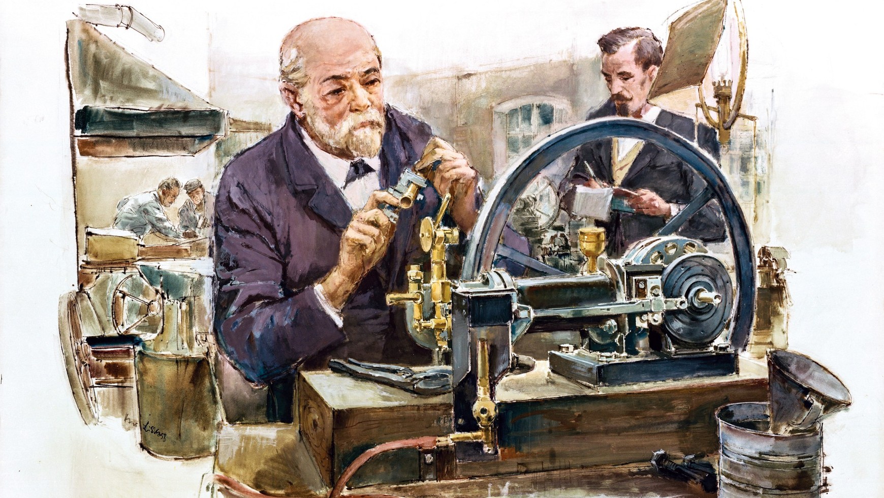 Daimler i Maybach (rysunek Hansa Liski) pracują nad pierwszym silnikiem wysokoobrotowym.