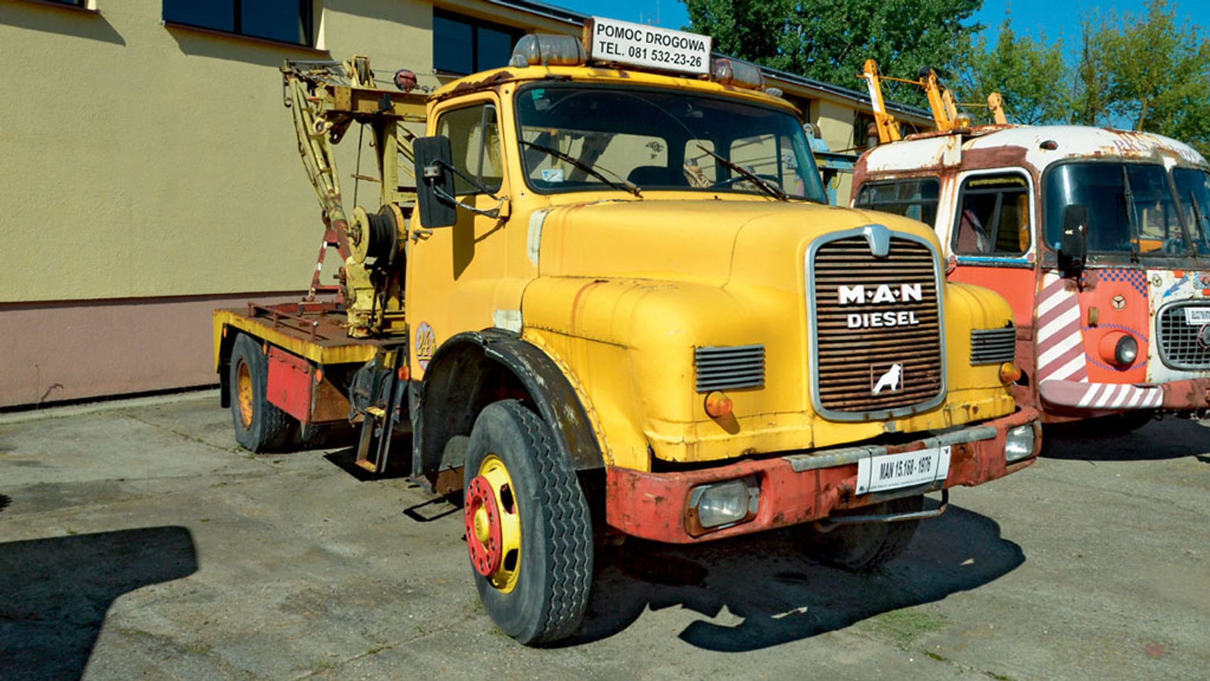 MAN 15.168 (1976 r.) z linową zabudową wysięgnikową Holmes – napęd mechaniczny od skrzyni biegów. Obok najstarszy „ogórek” holownik w Polsce (nr ramy 23)