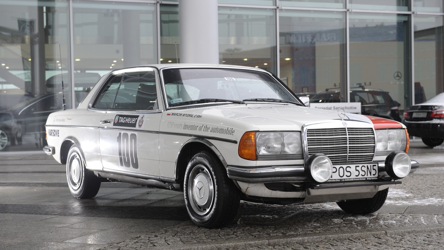 Wśród 98 samochodów na warszawskim Placu Teatralnym był też Mercedes-Benz 280 CE z 1977 r. Jest to jeden z kilku historycznych modeli tej marki, które kiedyś startowały w głównym rajdzie Monte Carlo i dziś mogą pojechać w jego historycznym odpowiedniku.
