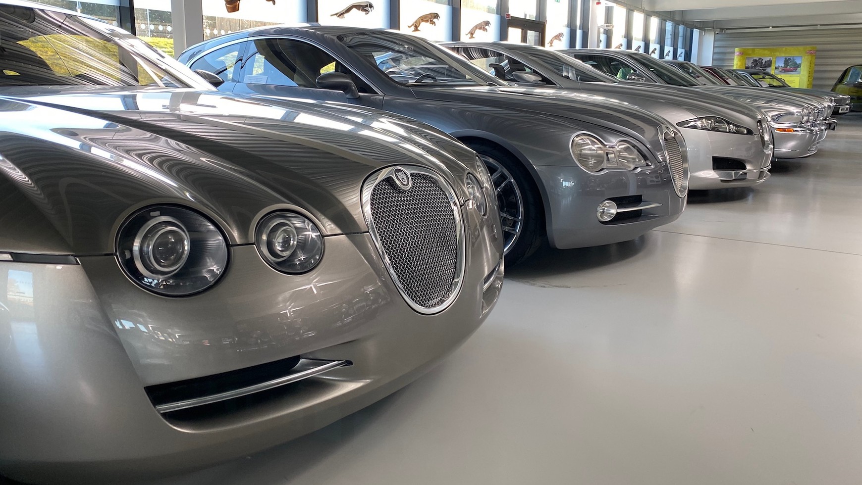 Z prawej błyszczy Jaguar X350, czyli przedprodukcyjny XJ 7. generacji, z nadwoziem z polerowanego aluminium. Efektowne wykończenie nadwozia miało podkreślać szerokie zastosowanie aluminium w konstrukcji nadwozia.