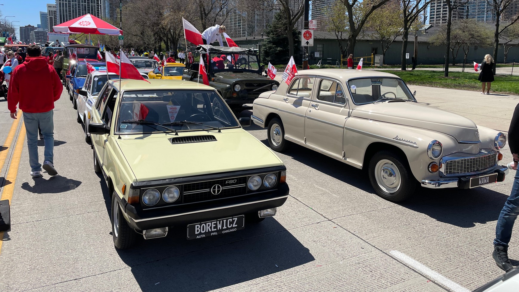 Wśród Polaków i platform sunących przez amerykańskie miasto znalazło się też miejsce dla legend, które przez lata były królami szos na naszych polskich drogach i właśnie stamtąd trafiły na amerykańską ziemię. Na pochodzie pojawiły się auta z klubu działającego w Chicago, który zrzesza miłośników polskich aut.