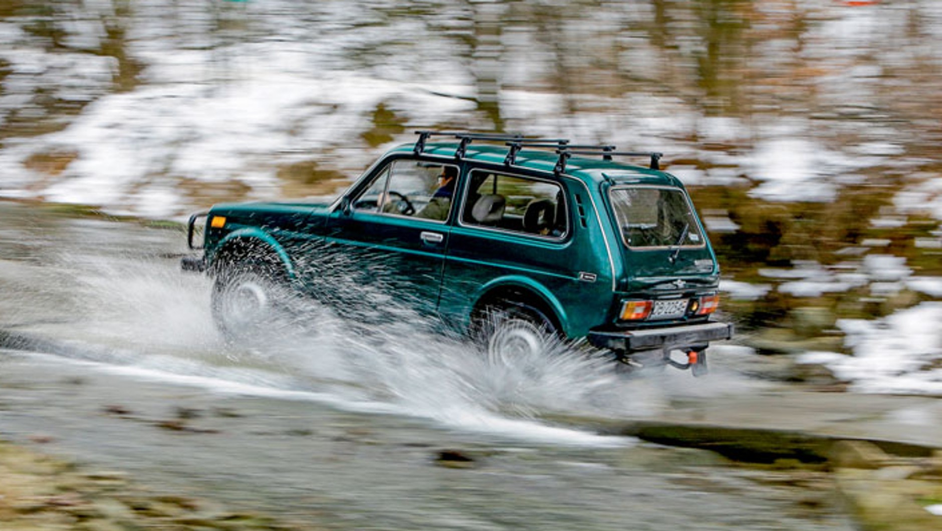 Łada Niva ma 220 mm prześwitu – bez problemu może zanurzyć się na głębokość 65 cm i nie zassać wody do układu dolotowego. Ale to, że przejedzie przez głęboką wodę, nie oznacza jeszcze, że do środka trochę się jej nie dostanie...