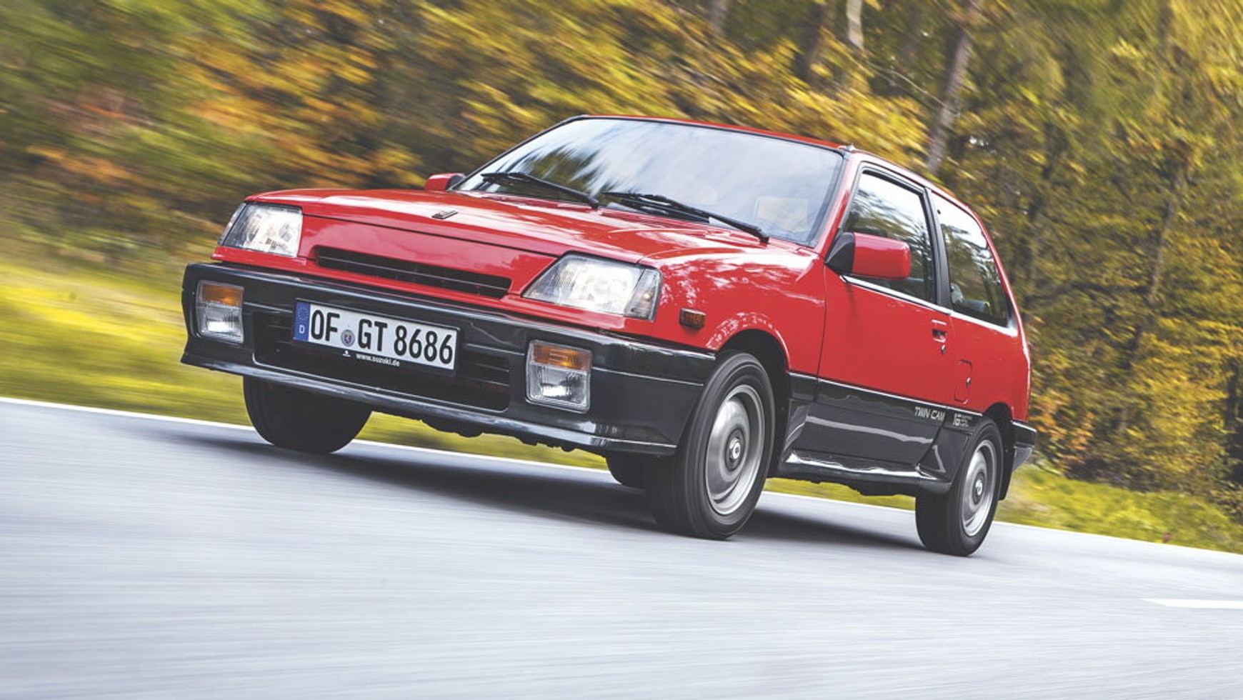 Jesteśmy przekonani, że nie wiedział, z jakim samochodem ma do czynienia. Odpowiadamy: Suzuki Swift GTi, 750 kg masy i silnik o mocy 101 KM – czy ktoś ma jeszcze jakieś pytania? Teraz może już nie, ale nasi koledzy z „Auto Bilda” kiedyś mieli. Dlatego w sierpniu 1988 roku, gdy idea GTi wkroczyła do klasy małych aut, zrobili porównanie sześciu modeli tego typu: Daihatsu Charade Turbo GTi, Fiata Uno turbo i.e., Opla Corsy GSi, Peugeota 205 GTi, Renault 5 GTE i właśnie Suzuki Swifta GTi.