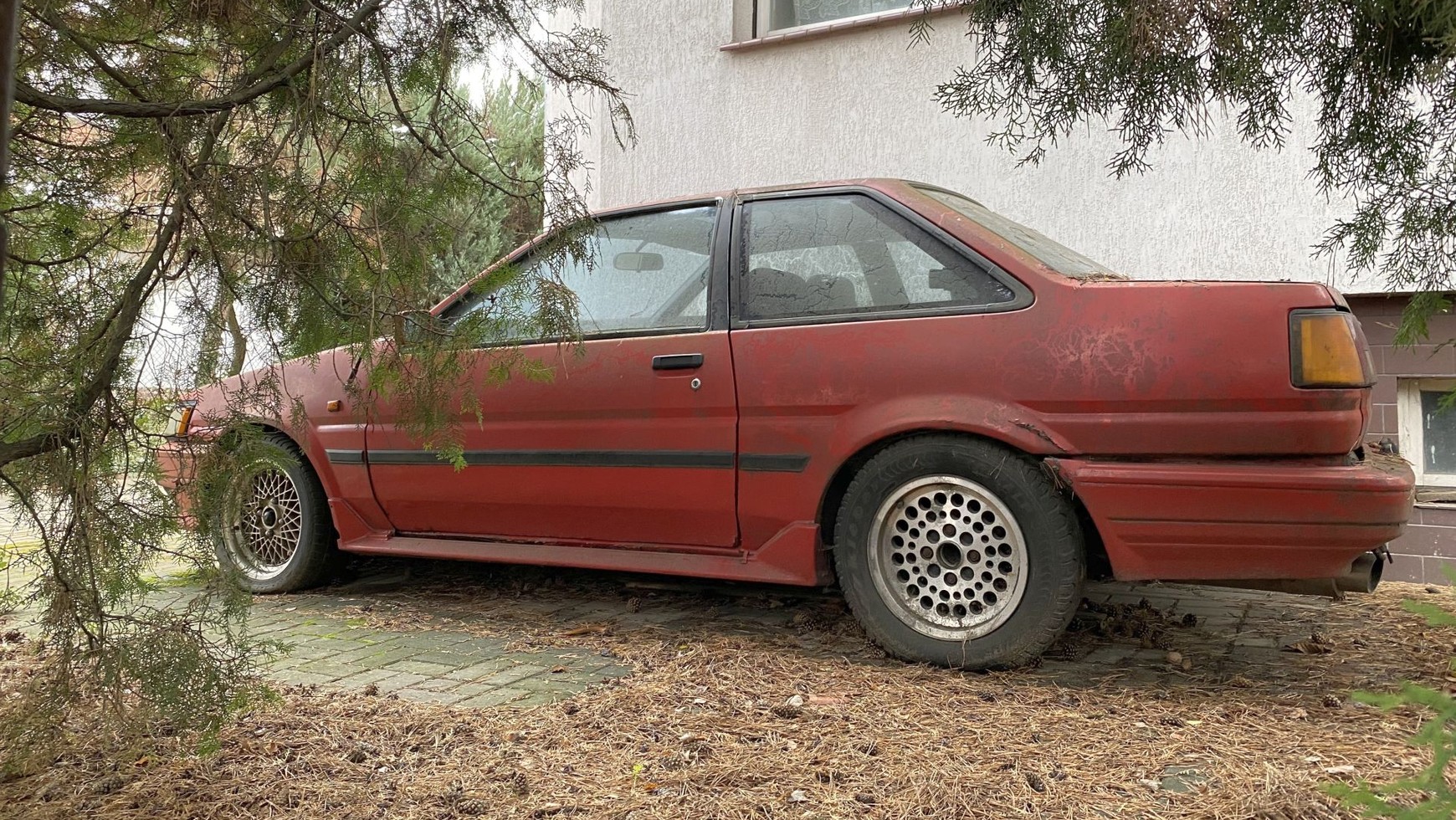 To co dostałem spowodowało, że spadłem z krzesła – czerwona Toyota AE86, a dokładnie dwudrzwiowa Corolla GT z przodem Levin, czyli mocno europejska specyfikacja AE86. Auto stało sobie w ogródku, pod iglastym drzewem – było widać, że długo. Mech, korozja i igiełki z drzew, ale i tak czerwona Corolla robiła piorunujące wrażenie. Trzeba było szybko jechać do Wrocławia.