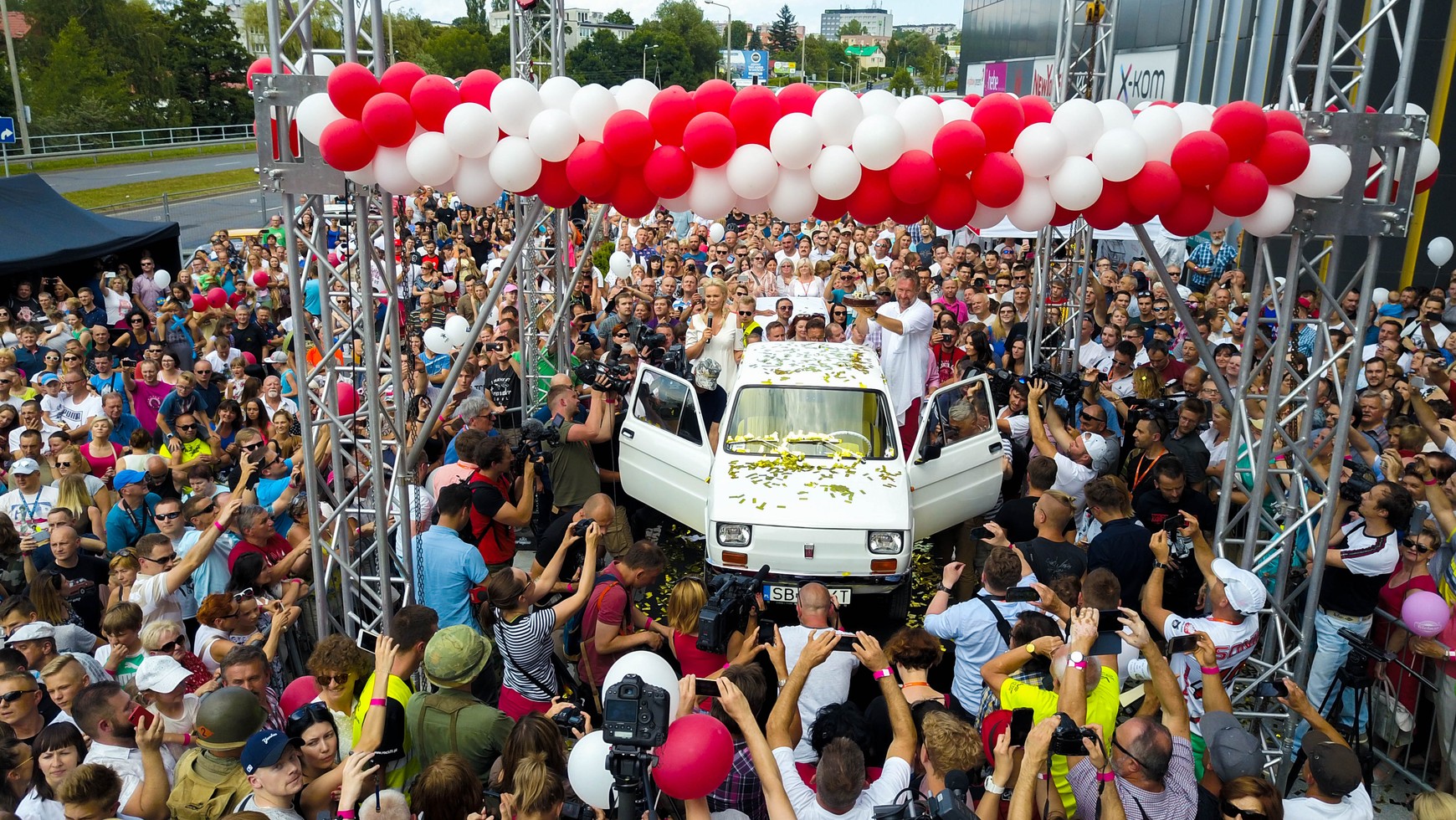 Biały, Bielsko-Biały! Po tych słowach pokazano Malucha dla Toma Hanksa w dniu 61. urodzin amerykańskiego aktora przed Centrum Handlowym Gemini Park w Bielsku-Białej.